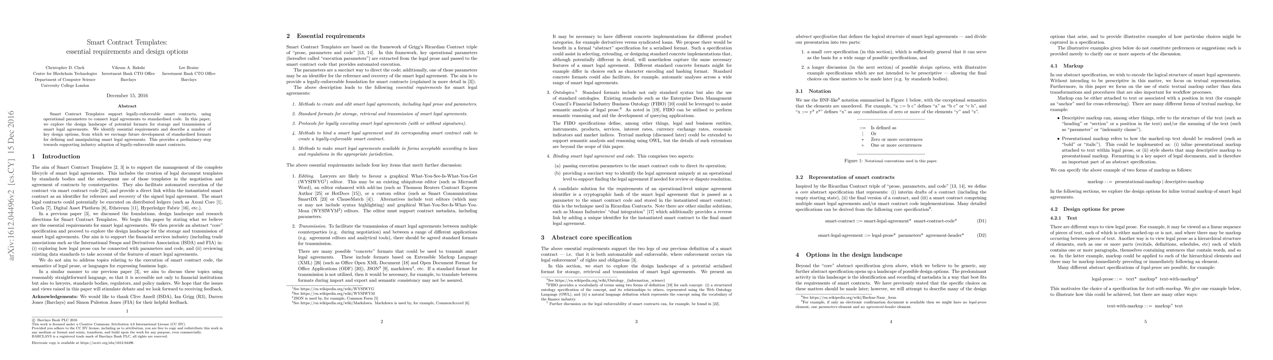 This paper investigates the essential requirements and design options for smart contract templates, aiming to connect legal agreements with standardized code. It outlines potential formats for the storage and transmission of smart legal agreements, providing a foundation for future standardization and industry adoption of legally-enforceable smart contracts.