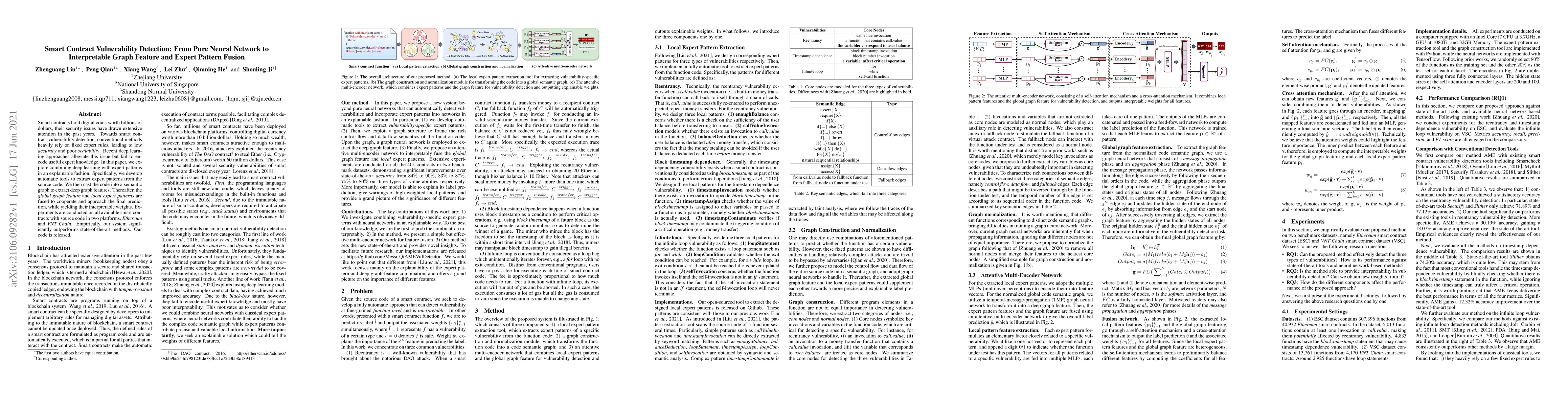 Smart contracts hold digital coins worth billions of dollars, their security issues have drawn extensive attention in the past years. Towards smart contract vulnerability detection, conventional methods heavily rely on fixed expert rules, leading to low accuracy and poor scalability. Recent deep learning approaches alleviate this issue but fail to encode useful expert knowledge. In this paper, we explore combining deep learning with expert patterns in an explainable fashion. Specifically, we develop automatic tools to extract expert patterns from the source code. We then cast the code into a semantic graph to extract deep graph features. Thereafter, the global graph feature and local expert patterns are fused to cooperate and approach the final prediction, while yielding their interpretable weights. Experiments are conducted on all available smart contracts with source code in two platforms, Ethereum and VNT Chain. Empirically, our system significantly outperforms state-of-the-art methods. Our code is released.