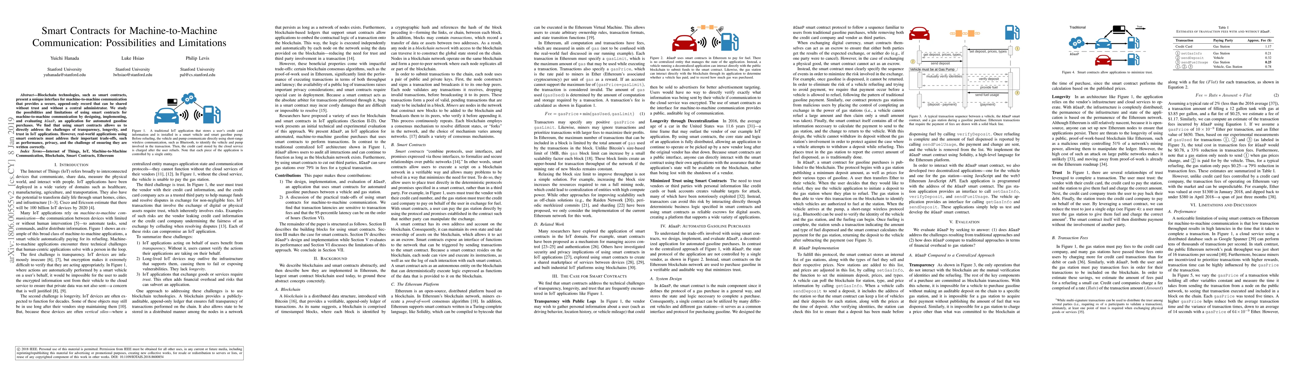 Blockchain technologies, such as smart contracts, present a unique interface for machine-to-machine communication that provides a secure, append-only record that can be shared without trust and without a central administrator. We study the possibilities and limitations of using smart contracts for machine-to-machine communication by designing, implementing, and evaluating AGasP, an application for automated gasoline purchases. We find that using smart contracts allows us to directly address the challenges of transparency, longevity, and trust in IoT applications. However, real-world applications using smart contracts must address their important trade-offs, such as performance, privacy, and the challenge of ensuring they are written correctly.