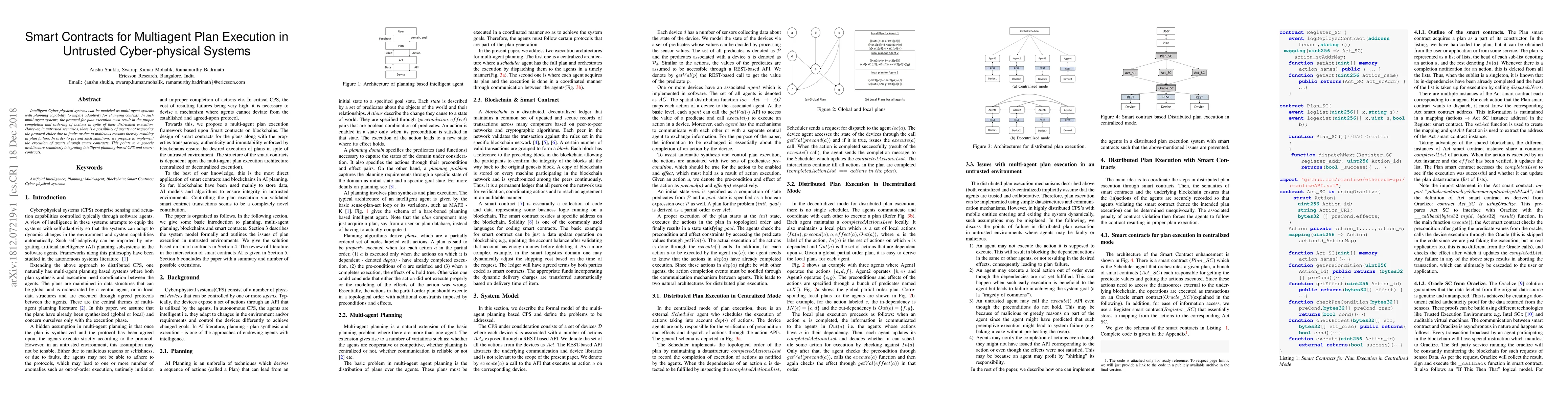 Intelligent Cyber-physical systems can be modelled as multi-agent systems with planning capability to impart adaptivity for changing contexts. In such multi-agent systems, the protocol for plan execution must result in the proper completion and ordering of actions in spite of their distributed execution. However, in untrusted scenarios, there is a possibility of agents not respecting the protocol either due to faults or due to malicious reasons thereby resulting in plan failure. In order to prevent such situations, we propose to implement the execution of agents through smart contracts. This points to a generic architecture seamlessly integrating intelligent planning-based CPS and smart-contracts.