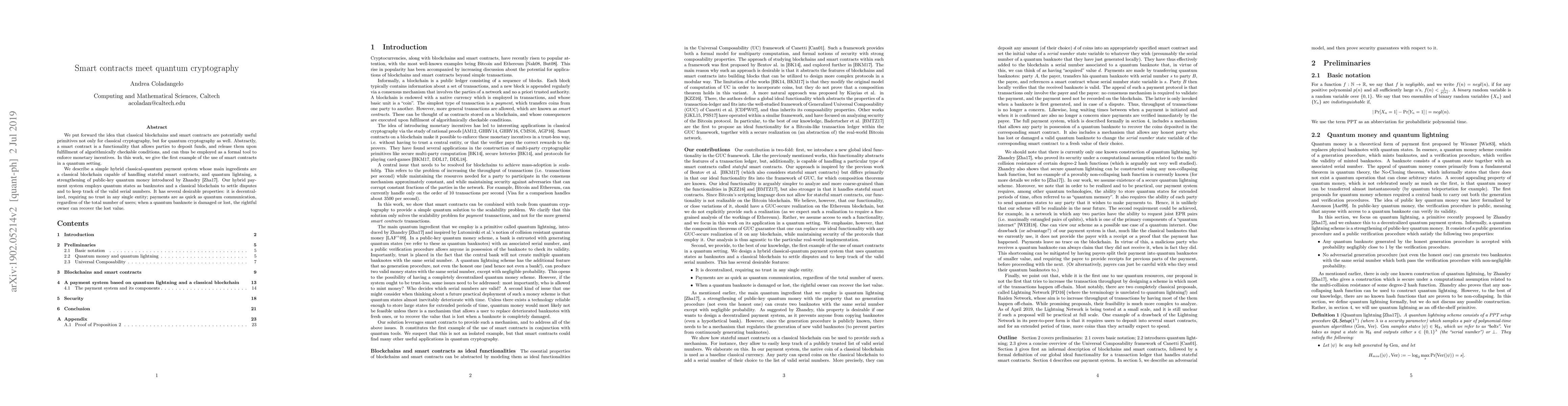 We put forward the idea that classical blockchains and smart contracts are potentially useful primitives not only for classical cryptography, but for quantum cryptography as well. Abstractly, a smart contract is a functionality that allows parties to deposit funds, and release them upon fulfillment of algorithmically checkable conditions, and can thus be employed as a formal tool to enforce monetary incentives. In this work, we give the first example of the use of smart contracts in a quantum setting. We describe a simple hybrid classical-quantum payment system whose main ingredients are a classical blockchain capable of handling stateful smart contracts, and quantum lightning, a strengthening of public-key quantum money introduced by Zhandry [Eurocrypt 2019]. Our hybrid payment system uses quantum states as banknotes and a classical blockchain to settle disputes and to keep track of the valid serial numbers. It has several desirable properties: it is decentralized, requiring no trust in any single entity; payments are as quick as quantum communication, regardless of the total number of users; when a quantum banknote is damaged or lost, the rightful owner can recover the lost value.