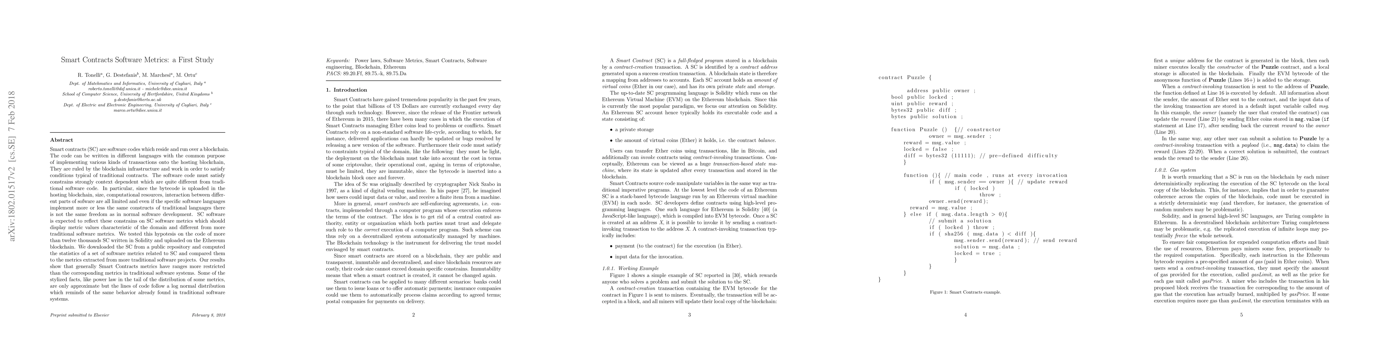 Smart contracts (SC) are software codes which reside and run over a blockchain. The code can be written in different languages with the common purpose of implementing various kinds of transactions onto the hosting blockchain, They are ruled by the blockchain infrastructure and work in order to satisfy conditions typical of traditional contracts. The software code must satisfy constrains strongly context dependent which are quite different from traditional software code. In particular, since the bytecode is uploaded in the hosting blockchain, size, computational resources, interaction between different parts of software are all limited and even if the specific software languages implement more or less the same constructs of traditional languages there is not the same freedom as in normal software development. SC software is expected to reflect these constrains on SC software metrics which should display metric values characteristic of the domain and different from more traditional software metrics. We tested this hypothesis on the code of more than twelve thousands SC written in Solidity and uploaded on the Ethereum blockchain. We downloaded the SC from a public repository and computed the statistics of a set of software metrics related to SC and compared them to the metrics extracted from more traditional software projects. Our results show that generally Smart Contracts metrics have ranges more restricted than the corresponding metrics in traditional software systems. Some of the stylized facts, like power law in the tail of the distribution of some metrics, are only approximate but the lines of code follow a log normal distribution which reminds of the same behavior already found in traditional software systems.