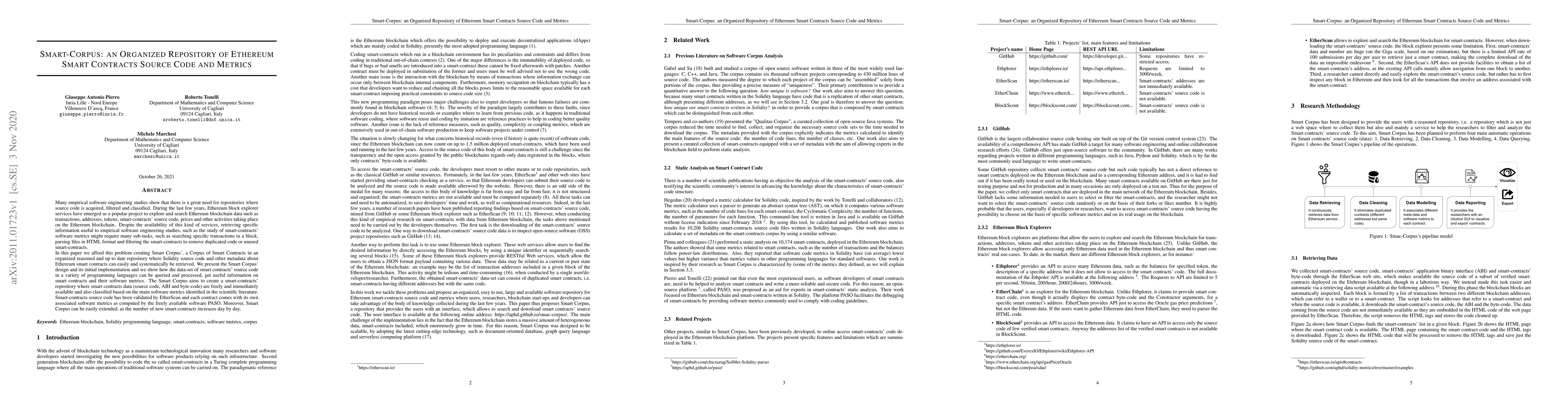 Smart-Corpus is an organized repository for Ethereum smart contracts' Solidity source code and metadata, designed to facilitate empirical software engineering studies. It provides an easily accessible, classified, and up-to-date collection of smart contracts, along with their associated software metrics, validated by EtherScan and computed using PASO.