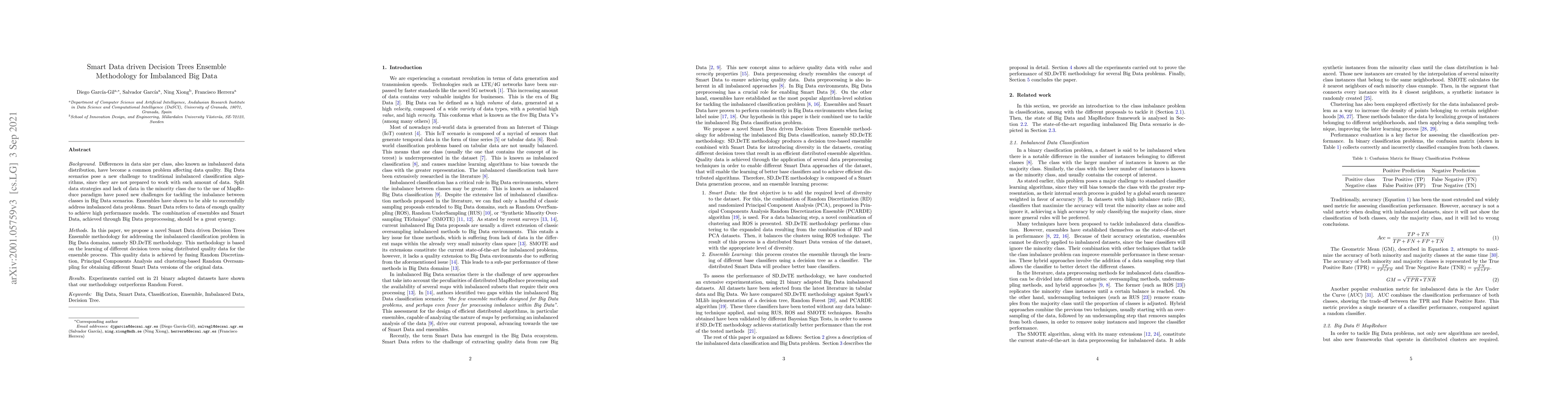 This paper proposes a novel SD_DeTE methodology combining Smart Data driven Decision Trees Ensembles to tackle imbalanced classification in Big Data scenarios. The methodology leverages preprocessing techniques like Random Discretization, PCA, and clustering-based Random Oversampling to enhance data quality, leading to improved performance over Random Forest in experiments across 21 datasets.