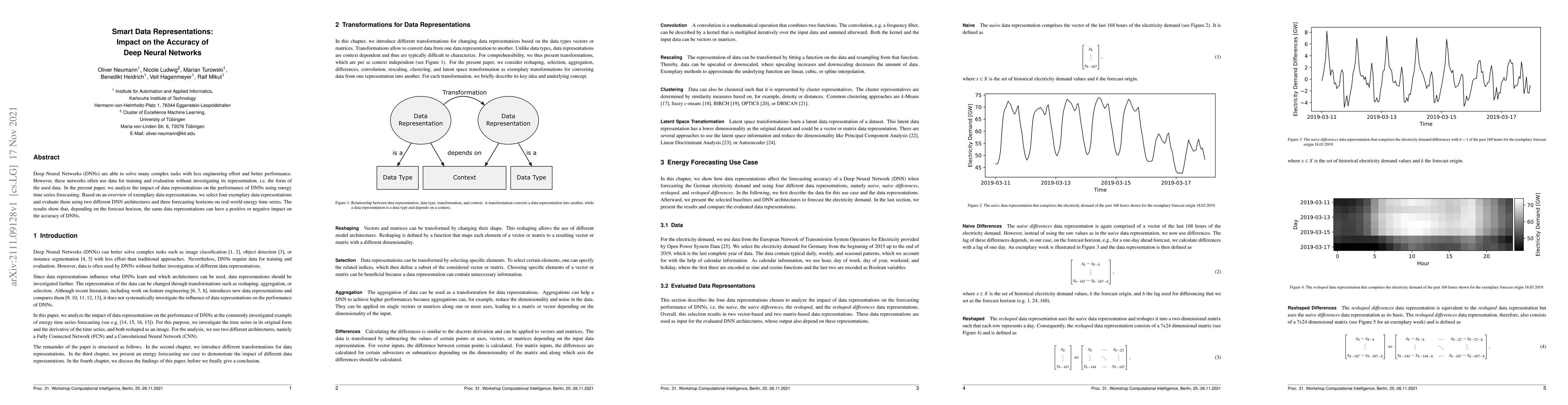 Deep Neural Networks are able to solve many complex tasks with less engineering effort and better performance. However, these networks often use data for training and evaluation without investigating its representation, i.e.~the form of the used data. In the present paper, we analyze the impact of data representations on the performance of Deep Neural Networks using energy time series forecasting. Based on an overview of exemplary data representations, we select four exemplary data representations and evaluate them using two different Deep Neural Network architectures and three forecasting horizons on real-world energy time series. The results show that, depending on the forecast horizon, the same data representations can have a positive or negative impact on the accuracy of Deep Neural Networks.
