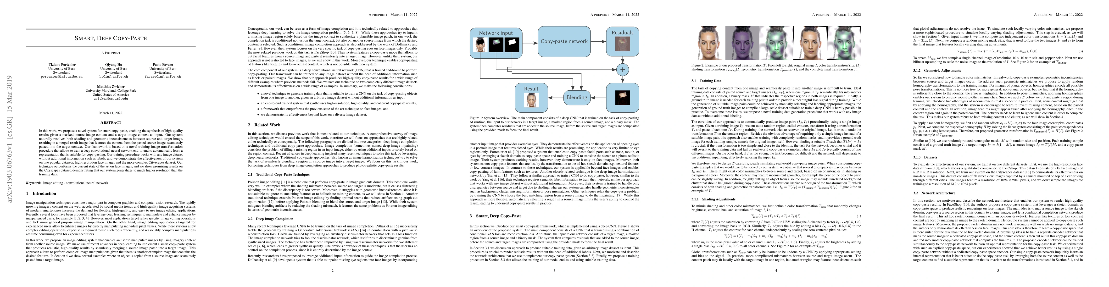 In this work, we propose a novel system for smart copy-paste, enabling the synthesis of high-quality results given a masked source image content and a target image context as input. Our system naturally resolves both shading and geometric inconsistencies between source and target image, resulting in a merged result image that features the content from the pasted source image, seamlessly pasted into the target context. Our framework is based on a novel training image transformation procedure that allows to train a deep convolutional neural network end-to-end to automatically learn a representation that is suitable for copy-pasting. Our training procedure works with any image dataset without additional information such as labels, and we demonstrate the effectiveness of our system on two popular datasets, high-resolution face images and the more complex Cityscapes dataset. Our technique outperforms the current state of the art on face images, and we show promising results on the Cityscapes dataset, demonstrating that our system generalizes to much higher resolution than the training data.