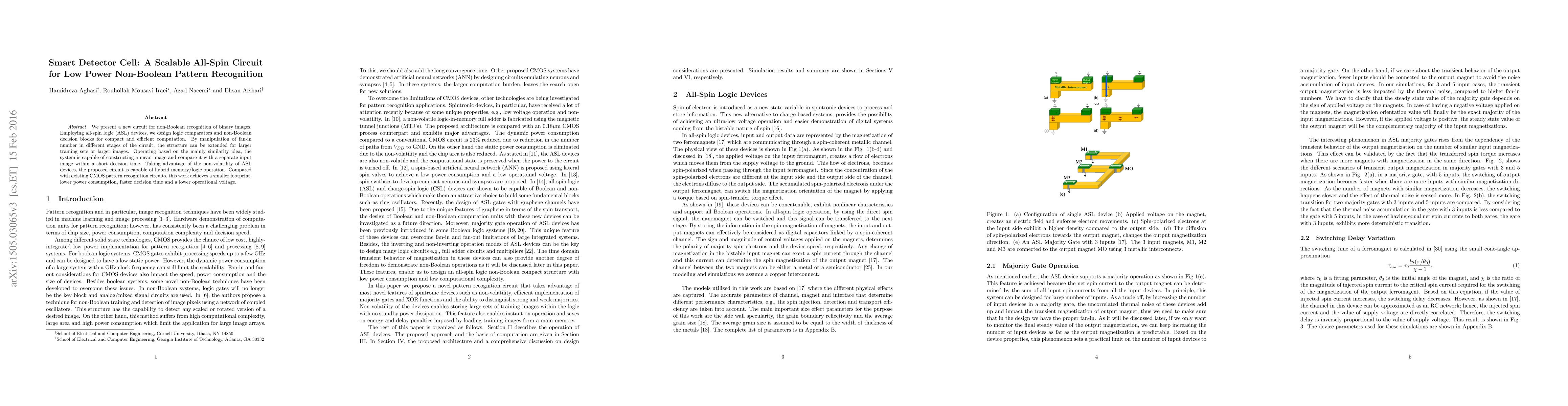 This paper introduces a scalable all-spin circuit for low power non-Boolean pattern recognition using all-spin logic devices, achieving smaller footprint, lower power, faster decision times, and lower voltage compared to CMOS circuits. The design leverages similarity-based computation and non-volatility for efficient hybrid memory/logic operation.
