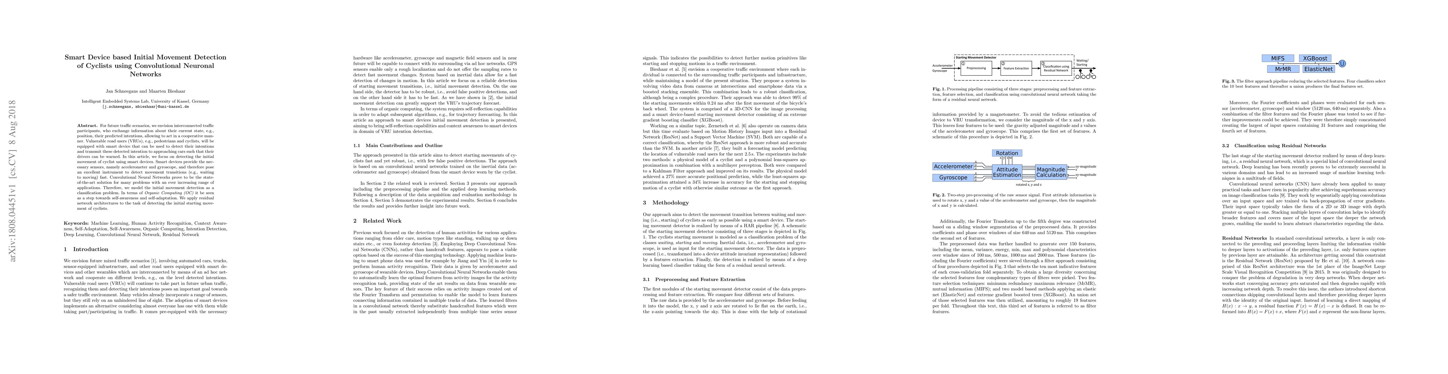 For future traffic scenarios, we envision interconnected traffic participants, who exchange information about their current state, e.g., position, their predicted intentions, allowing to act in a cooperative manner. Vulnerable road users (VRUs), e.g., pedestrians and cyclists, will be equipped with smart device that can be used to detect their intentions and transmit these detected intention to approaching cars such that their drivers can be warned. In this article, we focus on detecting the initial movement of cyclist using smart devices. Smart devices provide the necessary sensors, namely accelerometer and gyroscope, and therefore pose an excellent instrument to detect movement transitions (e.g., waiting to moving) fast. Convolutional Neural Networks prove to be the state-of-the-art solution for many problems with an ever increasing range of applications. Therefore, we model the initial movement detection as a classification problem. In terms of Organic Computing (OC) it be seen as a step towards self-awareness and self-adaptation. We apply residual network architectures to the task of detecting the initial starting movement of cyclists.