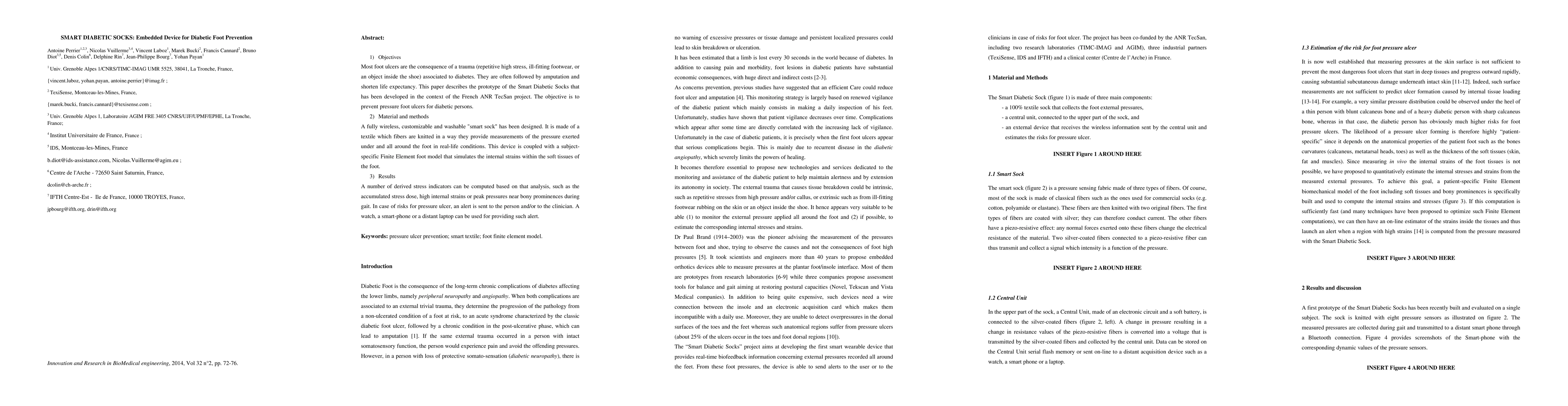 1) Objectives Most foot ulcers are the consequence of a trauma (repetitive high stress, ill-fitting footwear, or an object inside the shoe) associated to diabetes. They are often followed by amputation and shorten life expectancy. This paper describes the prototype of the Smart Diabetic Socks that has been developed in the context of the French ANR TecSan project. The objective is to prevent pressure foot ulcers for diabetic persons. 2) Material and methods A fully wireless, customizable and washable "smart sock" has been designed. It is made of a textile which fibers are knitted in a way they provide measurements of the pressure exerted under and all around the foot in real-life conditions. This device is coupled with a subject-specific Finite Element foot model that simulates the internal strains within the soft tissues of the foot. 3) Results A number of derived stress indicators can be computed based on that analysis, such as the accumulated stress dose, high internal strains or peak pressures near bony prominences during gait. In case of risks for pressure ulcer, an alert is sent to the person and/or to the clinician. A watch, a smart-phone or a distant laptop can be used for providing such alert.