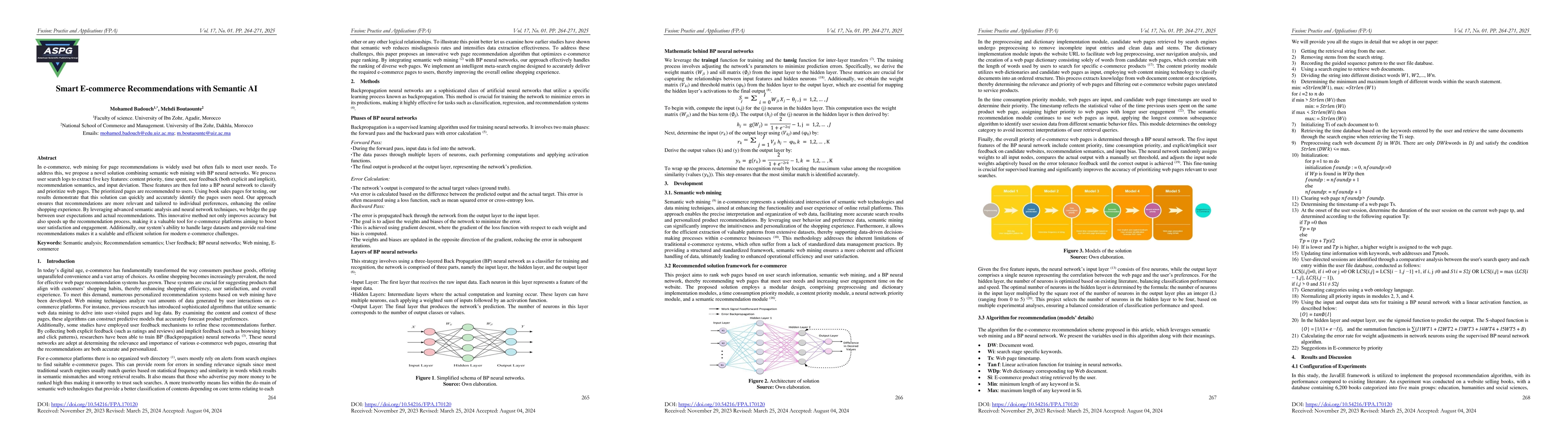 In e-commerce, web mining for page recommendations is widely used but often fails to meet user needs. To address this, we propose a novel solution combining semantic web mining with BP neural networks. We process user search logs to extract five key features: content priority, time spent, user feedback, recommendation semantics, and input deviation. These features are then fed into a BP neural network to classify and prioritize web pages. The prioritized pages are recommended to users. Using book sales pages for testing, our results demonstrate that this solution can quickly and accurately identify the pages users need. Our approach ensures that recommendations are more relevant and tailored to individual preferences, enhancing the online shopping experience. By leveraging advanced semantic analysis and neural network techniques, we bridge the gap between user expectations and actual recommendations. This innovative method not only improves accuracy but also speeds up the recommendation process, making it a valuable tool for e-commerce platforms aiming to boost user satisfaction and engagement. Additionally, our system ability to handle large datasets and provide real-time recommendations makes it a scalable and efficient solution for modern e-commerce challenges.