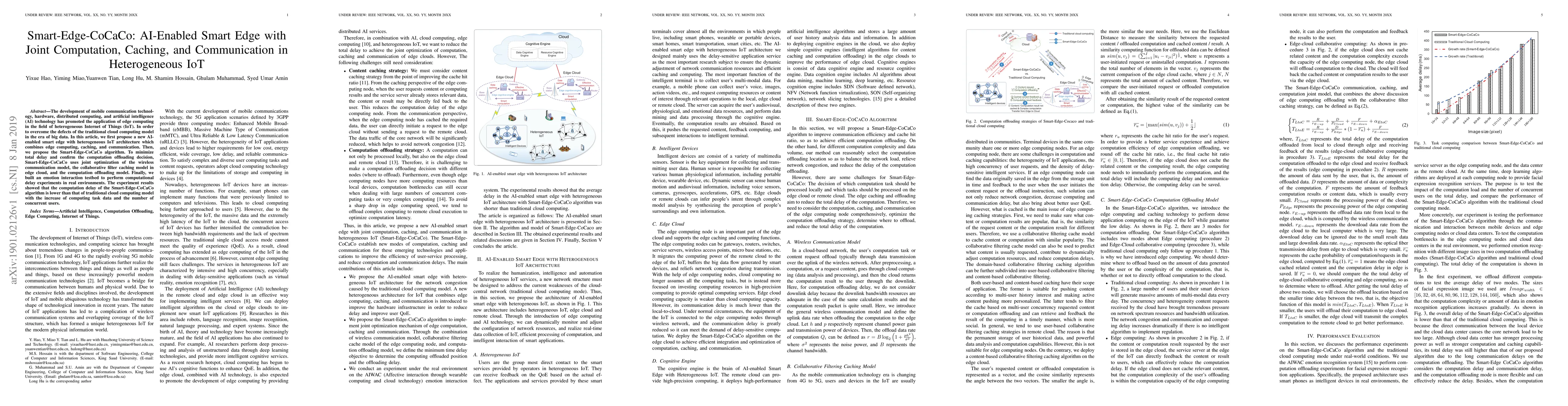 The development of mobile communication technology, hardware, distributed computing, and artificial intelligence (AI) technology has promoted the application of edge computing in the field of heterogeneous Internet of Things (IoT). In order to overcome the defects of the traditional cloud computing model in the era of big data. In this article, we first propose a new AIenabled smart edge with heterogeneous IoT architecture which combines edge computing, caching, and communication. Then, we propose the Smart-Edge-CoCaCo algorithm. To minimize total delay and confirm the computation offloading decision, Smart-Edge-CoCaCo uses joint optimization of the wireless communication model, the collaborative filter caching model in edge cloud, and the computation offloading model. Finally, we built an emotion interaction testbed to perform computational delay experiments in real environments. The experiment results showed that the computation delay of the Smart-Edge-CoCaCo algorithm is lower than that of traditional cloud computing model with the increase of computing task data and the number of concurrent users.