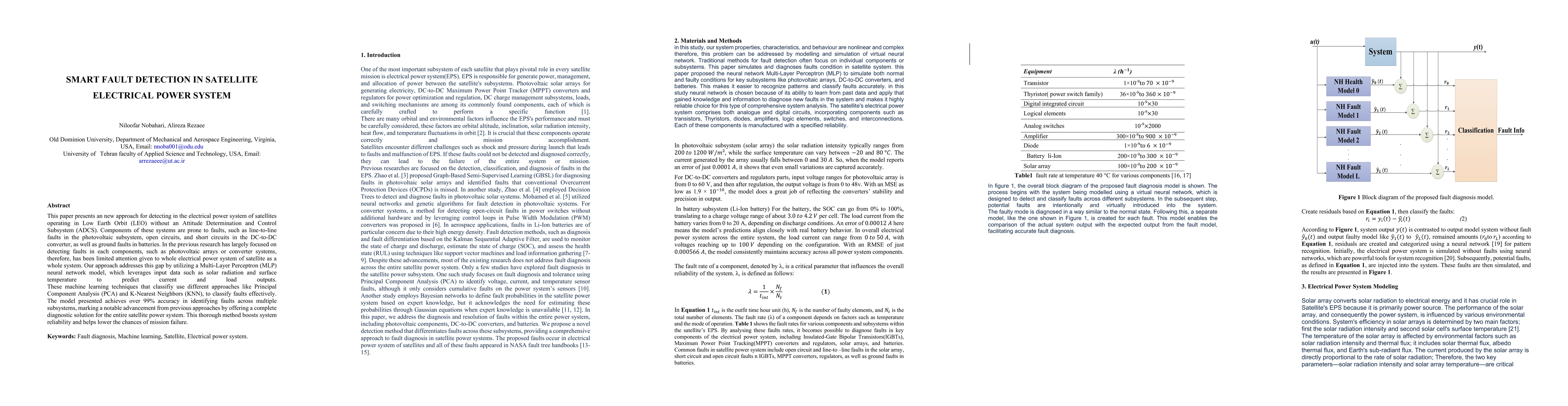 This paper presents an new approach for detecting in the electrical power system of satellites operating in Low Earth Orbit (LEO) without an Attitude Determination and Control Subsystem (ADCS). Components of these systems are prone to faults, such as line-to-line faults in the photovoltaic subsystem, open circuits, and short circuits in the DC-to-DC converter, as well as ground faults in batteries. In the previous research has largely focused on detecting faults in each components, such as photovoltaic arrays or converter systems, therefore, has been limited attention given to whole electrical power system of satellite as a whole system. Our approach addresses this gap by utilizing a Multi-Layer Perceptron (MLP) neural network model, which leverages input data such as solar radiation and surface temperature to predict current and load outputs. These machine learning techniques that classifiy use different approaches like Principal Component Analysis (PCA) and K-Nearest Neighbors (KNN), to classify faults effectively. The model presented achieves over 99% accuracy in identifying faults across multiple subsystems, marking a notable advancement from previous approaches by offering a complete diagnostic solution for the entire satellite power system. This thorough method boosts system reliability and helps lower the chances of mission failure