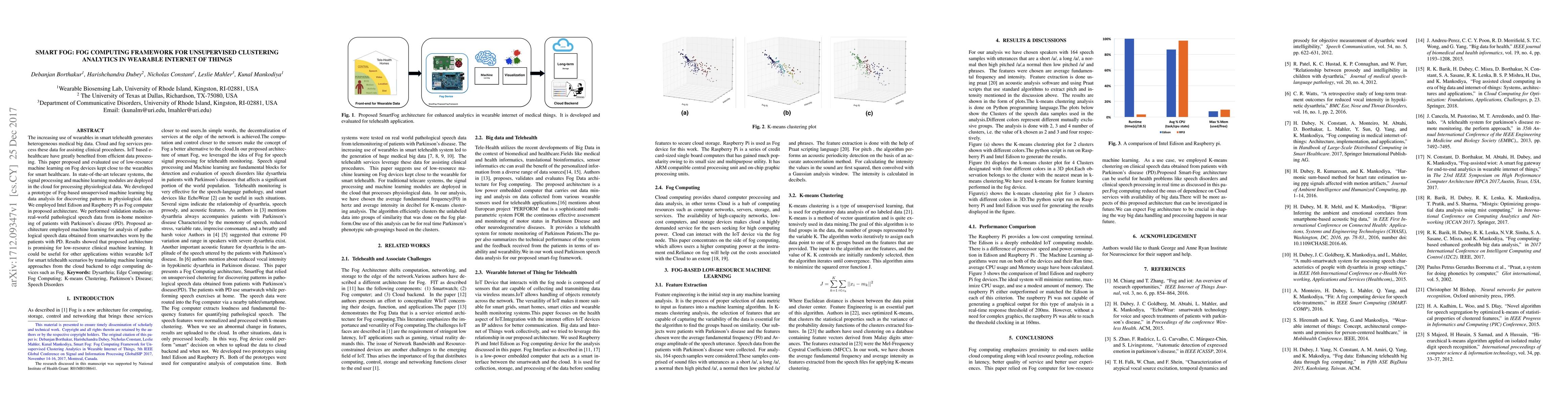 The increasing use of wearables in smart telehealth generates heterogeneous medical big data. Cloud and fog services process these data for assisting clinical procedures. IoT based ehealthcare have greatly benefited from efficient data processing. This paper proposed and evaluated use of low resource machine learning on Fog devices kept close to the wearables for smart healthcare. In state of the art telecare systems, the signal processing and machine learning modules are deployed in the cloud for processing physiological data. We developed a prototype of Fog-based unsupervised machine learning big data analysis for discovering patterns in physiological data. We employed Intel Edison and Raspberry Pi as Fog computer in proposed architecture. We performed validation studies on real-world pathological speech data from in home monitoring of patients with Parkinson's disease (PD). Proposed architecture employed machine learning for analysis of pathological speech data obtained from smartwatches worn by the patients with PD. Results showed that proposed architecture is promising for low-resource clinical machine learning. It could be useful for other applications within wearable IoT for smart telehealth scenarios by translating machine learning approaches from the cloud backend to edge computing devices such as Fog.