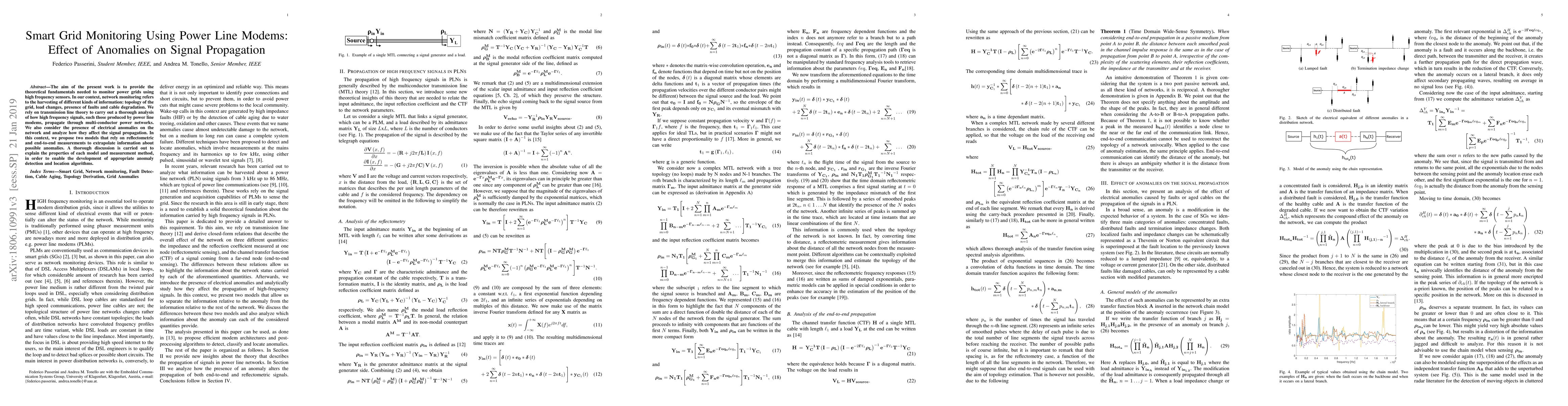 The aim of the present work is to provide the theoretical fundamentals needed to monitor power grids using high frequency sensors. In our context, network monitoring refers to the harvesting of different kinds of information: topology of the grid, load changes, presence of faults and cable degradation. We rely on transmission line theory to carry out a thorough analysis of how high frequency signals, such those produced by power line modems, propagate through multi-conductor power networks. We also consider the presence of electrical anomalies on the network and analyze how they affect the signal propagation. In this context, we propose two models that rely on reflectometric and end-to-end measurements to extrapolate information about possible anomalies. A thorough discussion is carried out to explain the properties of each model and measurement method, in order to enable the development of appropriate anomaly detection and location algorithms.