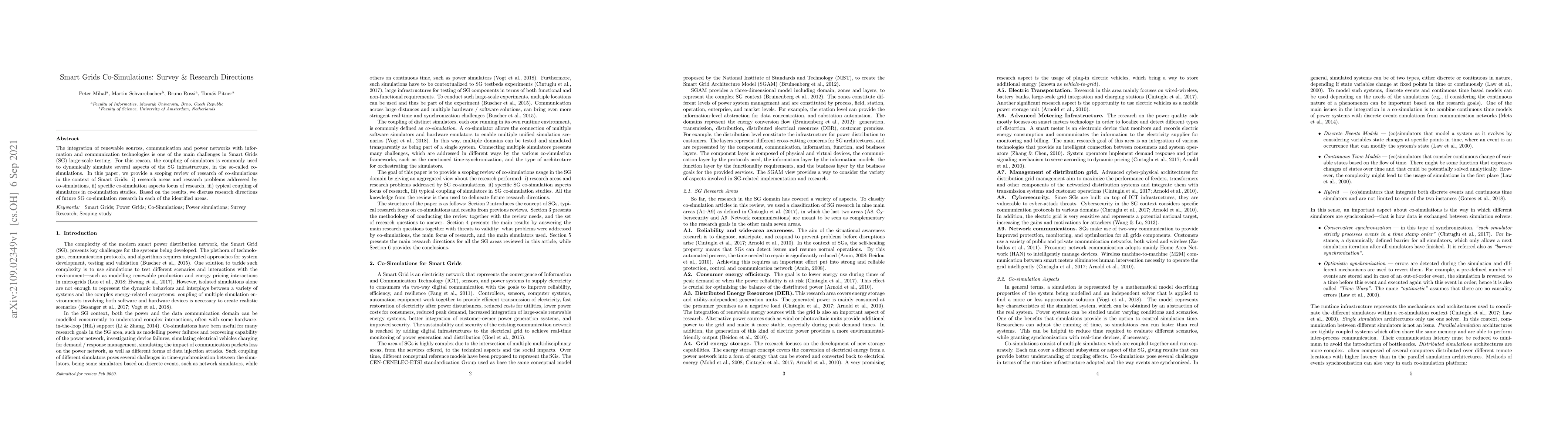 This paper reviews co-simulations in Smart Grids, summarizing research areas, specific aspects, and typical simulator coupling methods. It identifies future research directions to enhance SG large-scale testing through improved co-simulation techniques.