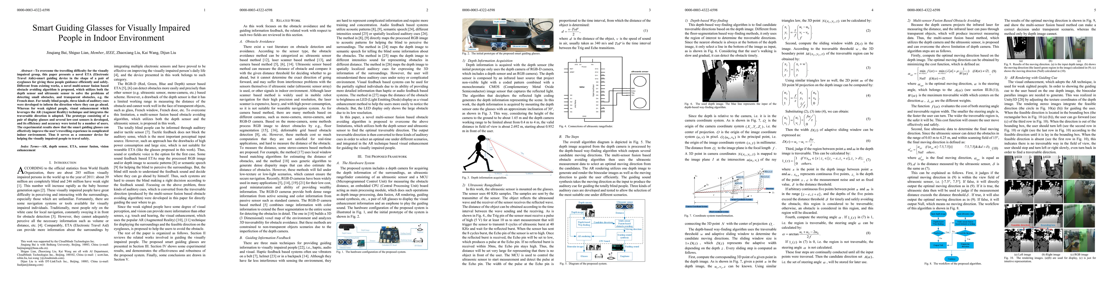 This paper introduces a smart guiding pair of glasses equipped with multi-sensor fusion for visually impaired individuals, offering obstacle detection and auditory/visual cues for navigation in indoor settings. Experimental results demonstrate its effectiveness in enhancing the travel experience for users.