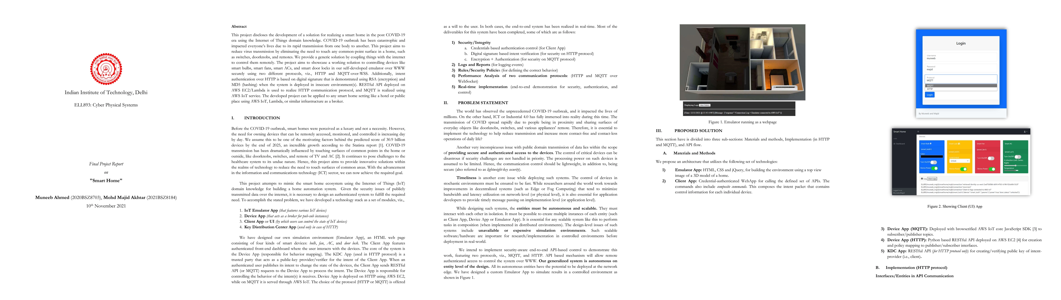 This study discloses the development of a solution for realizing a smart home in the post COVID-19 era using the Internet of Things domain knowledge. COVID-19 outbreak has been catastrophic and impacted everyone's lives due to its rapid transmission from one body to another. This study aims to reduce virus transmission by eliminating the need to touch any common-point surface in a home, such as switches, doorknobs, and remotes. We provide a generic solution by coupling things with the internet to control them remotely. The project aims to showcase a working solution to controlling devices like smart bulbs, smart fans, smart ACs, and smart door locks in our self-developed emulator over WWW securely using two different protocols, viz., HTTP and MQTT-over-WSS. Additionally, intent authentication over HTTP is based on digital signature that is demonstrated using RSA (encryption) and MD5 (hashing) when the system is deployed in insecure environment(s). RESTful API deployed on AWS EC2 is used to realize HTTP communication protocol, and MQTT is realized using AWS IoT service. The developed project can be applied to any smart home setting like a hotel or public place using AWS IoT, Lambda, or similar infrastructure as a broker.