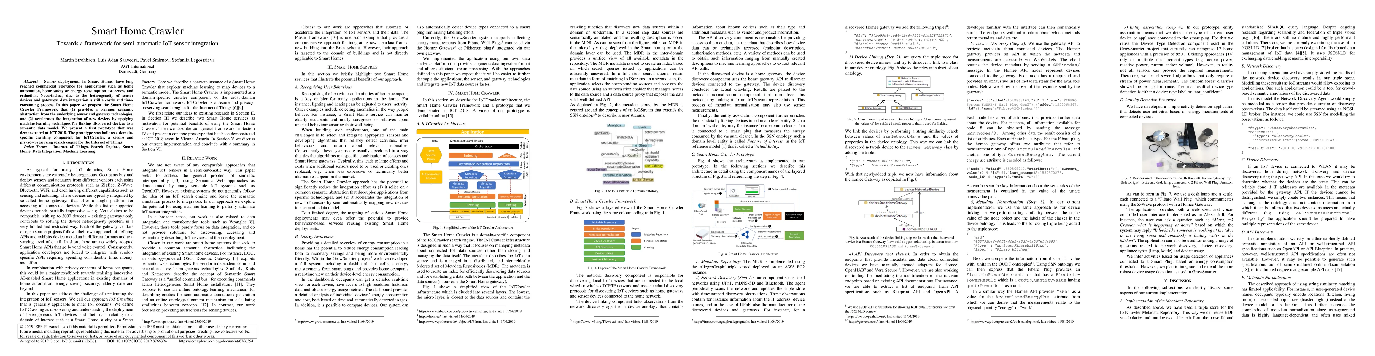 This paper introduces the Smart Home Crawler Framework to streamline IoT sensor integration in smart homes, offering a semantic abstraction for diverse devices and employing machine learning for faster device integration. A prototype was demonstrated at ICT 2018, built as a specialized component for IoTCrawler.