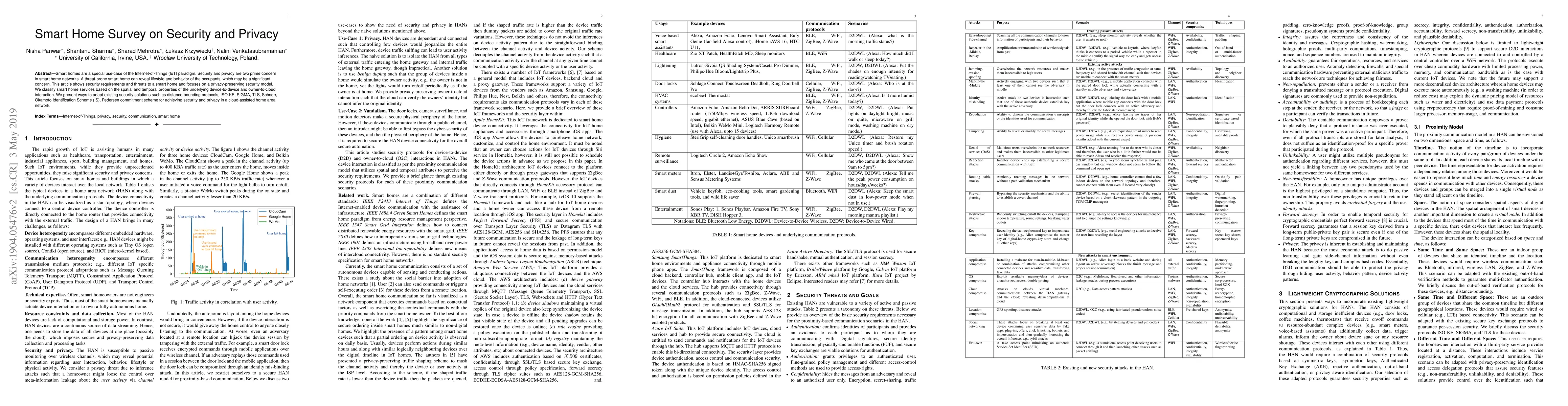 This paper investigates security and privacy concerns in smart home networks, emphasizing the potential threats to occupants' lifestyles and behaviors. It proposes a privacy-preserving security model and adapts existing security solutions like distance-bounding protocols and TLS for secure device-to-device and owner-to-cloud interactions in a cloud-assisted home area network.