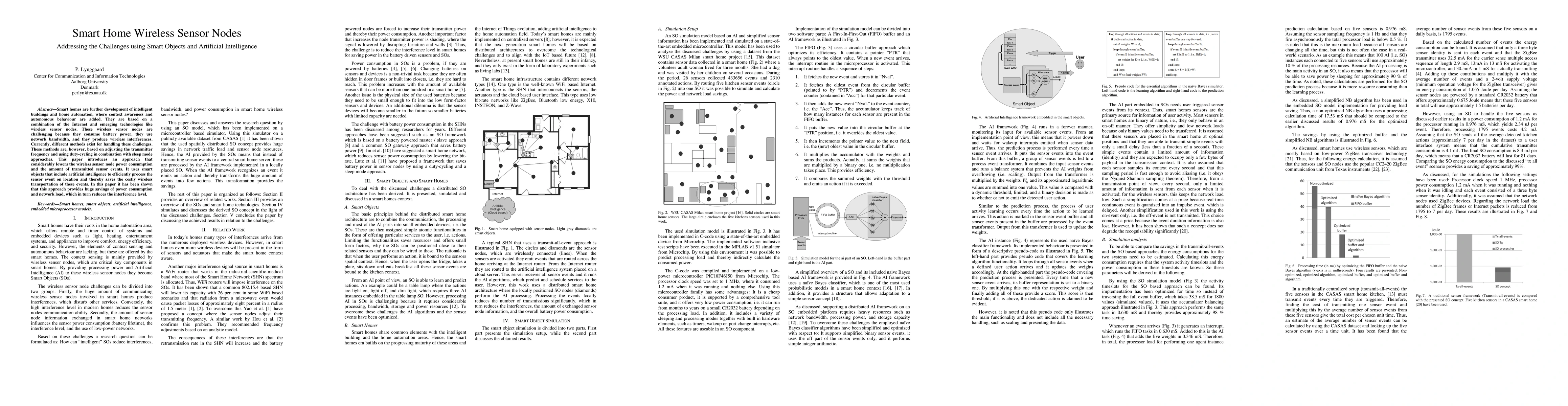 Smart homes are further development of intelligent buildings and home automation, where context awareness and autonomous behaviour are added. They are based on a combination of the Internet and emerging technologies like wireless sensor nodes. These wireless sensor nodes are challenging because they consume battery power, they use network bandwidth, and they produce wireless interferences. Currently, different methods exist for handling these challenges. These methods are, however, based on adjusting the transmitter frequency and using duty-cycling in combination with sleep mode approaches. This paper introduces an approach that considerably lowers the wireless sensor node power consumption and the amount of transmitted sensor events. It uses smart objects that include artificial intelligence to efficiently process the sensor event on location and thereby saves the costly wireless transportation of these events. In this paper it has been shown that this approach provides huge savings of power consumption and network load, which in turn reduces the interference level