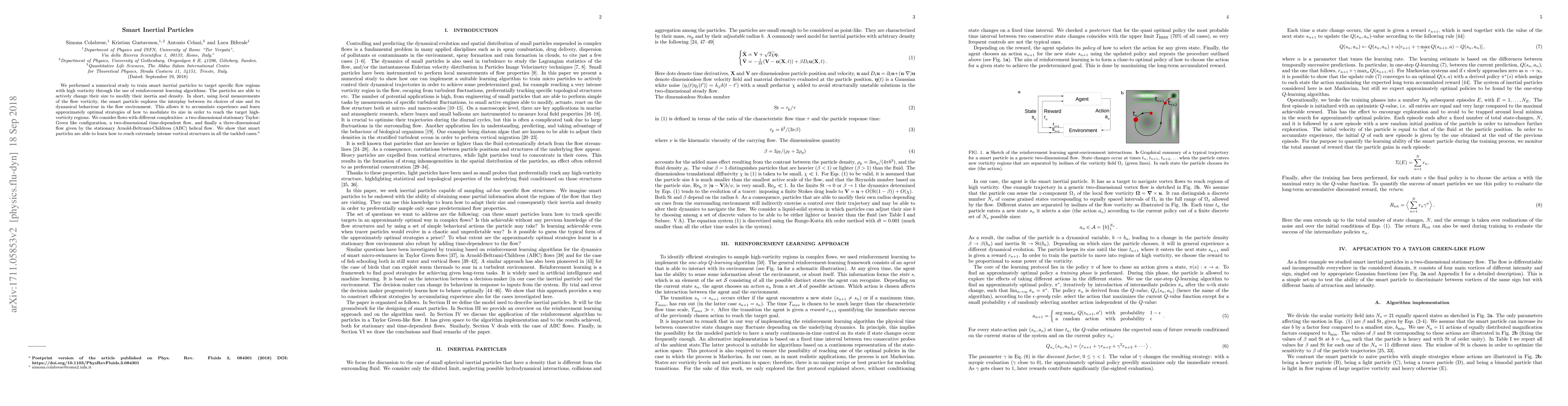 We performed a numerical study to train smart inertial particles to target specific flow regions with high vorticity through the use of reinforcement learning algorithms. The particles are able to actively change their size to modify their inertia and density. In short, using local measurements of the flow vorticity, the smart particle explores the interplay between its choices of size and its dynamical behaviour in the flow environment. This allows it to accumulate experience and learn approximately optimal strategies of how to modulate its size in order to reach the target high-vorticity regions. We consider flows with different complexities: a two-dimensional stationary Taylor-Green like configuration, a two-dimensional time-dependent flow, and finally a three-dimensional flow given by the stationary Arnold-Beltrami-Childress helical flow. We show that smart particles are able to learn how to reach extremely intense vortical structures in all the tackled cases.