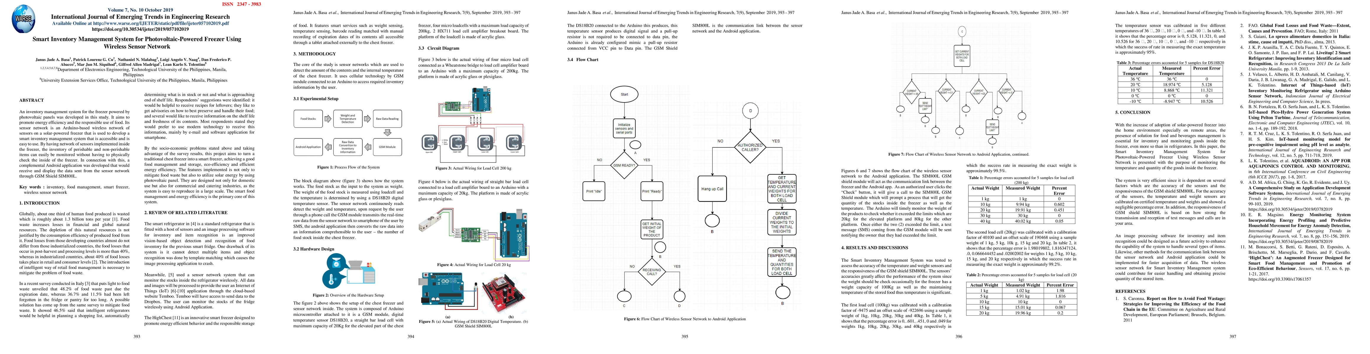 This study developed a smart inventory management system for a solar-powered freezer using an Arduino-based wireless sensor network to monitor perishable and non-perishable items without physical checks. An accompanying Android app displays the data transmitted via GSM Shield SIM800L.
