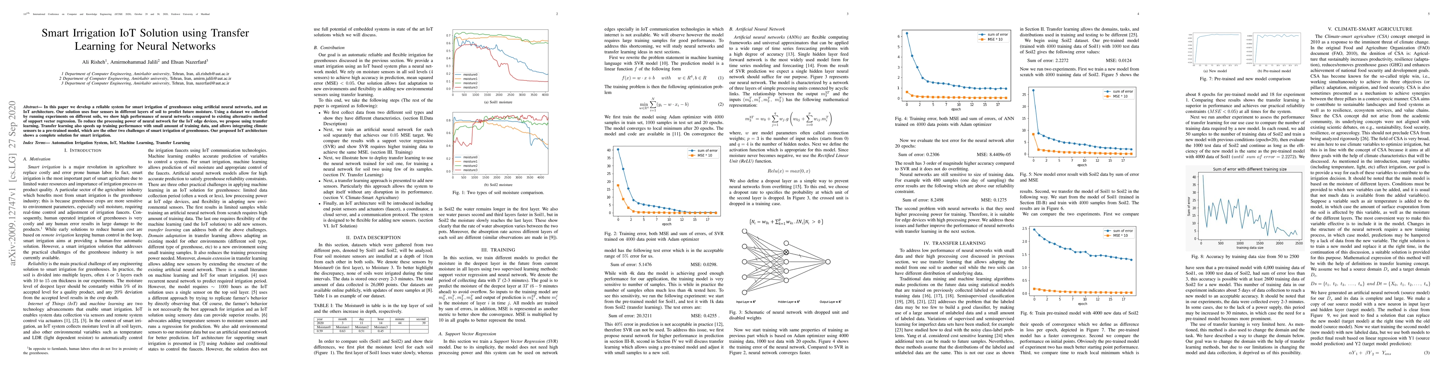 This paper presents a smart irrigation system for greenhouses using IoT and neural networks, employing transfer learning to enhance efficiency and training speed on edge devices. The system outperforms support vector regression and integrates climate sensors, offering a comprehensive solution for smart irrigation.