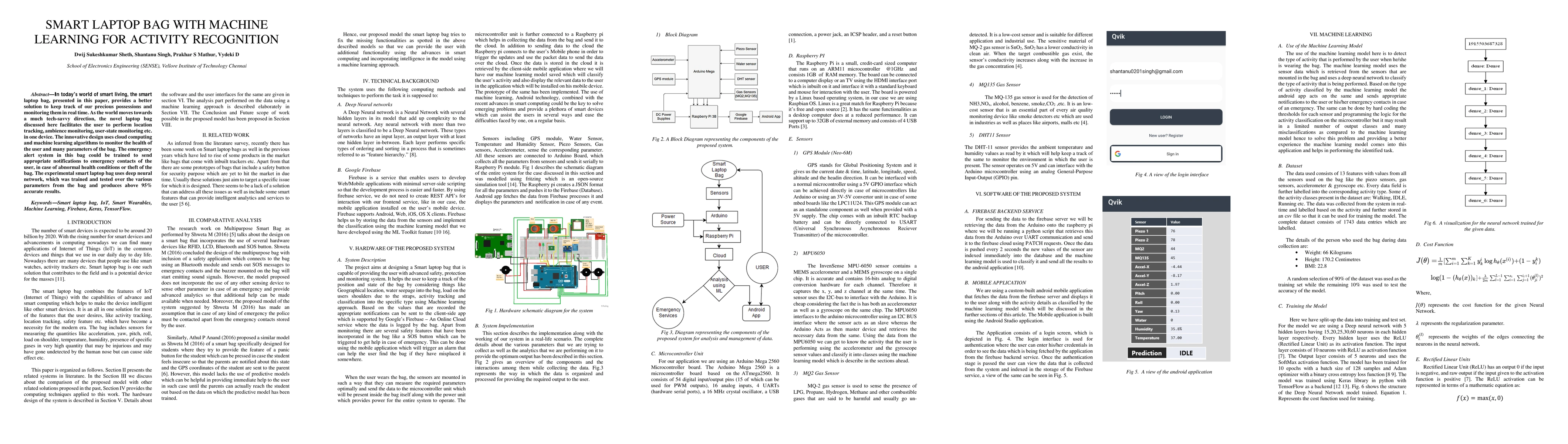 This paper presents a smart laptop bag equipped with machine learning for real-time activity recognition, offering location tracking, ambiance, and user-state monitoring. The bag uses deep neural networks to achieve over 95% accuracy in detecting abnormal conditions, triggering emergency alerts for theft or health issues.