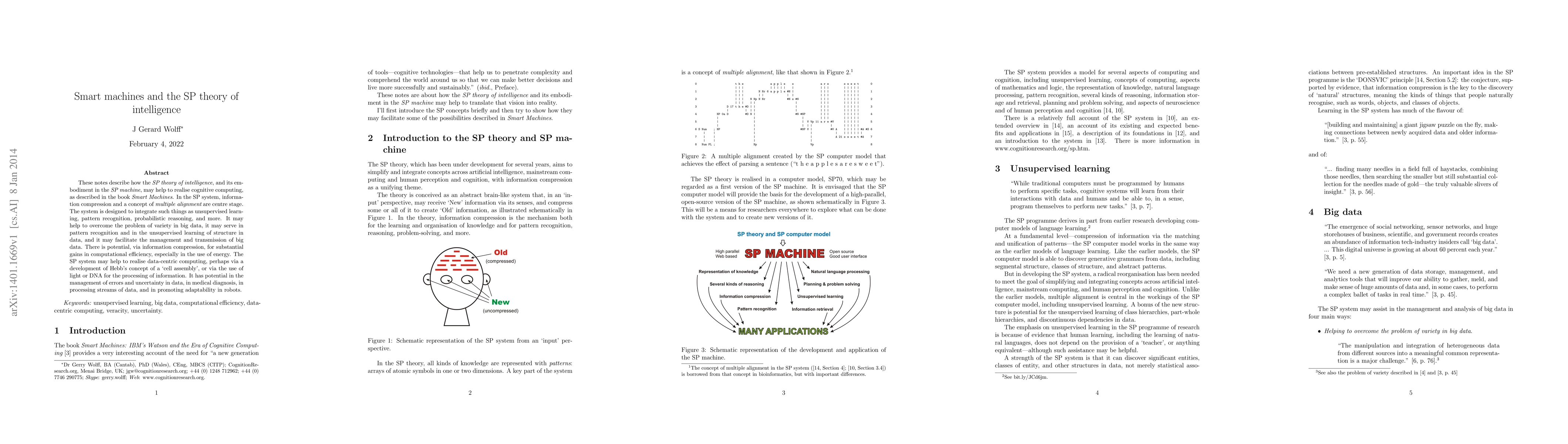 This paper explores the "SP theory of intelligence" and its application in "SP machines" to advance cognitive computing, emphasizing information compression and "multiple alignment" for tasks like unsupervised learning and pattern recognition. The SP system aims to enhance computational efficiency and manage big data, with potential applications in medical diagnosis, robotics, and data processing.
