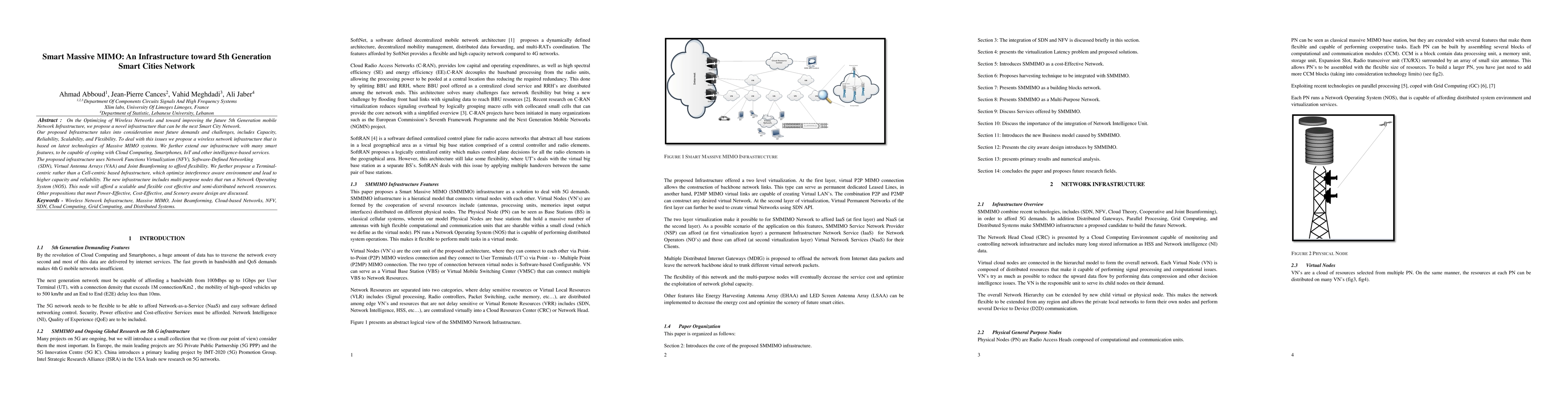 This paper proposes a novel Smart Massive MIMO Infrastructure for 5G Smart Cities, incorporating technologies like NFV, SDN, VAA, and Joint Beamforming to enhance capacity, reliability, scalability, and flexibility. It introduces a Terminal-centric approach for optimized interference management and cost-effective, scalable network resources.