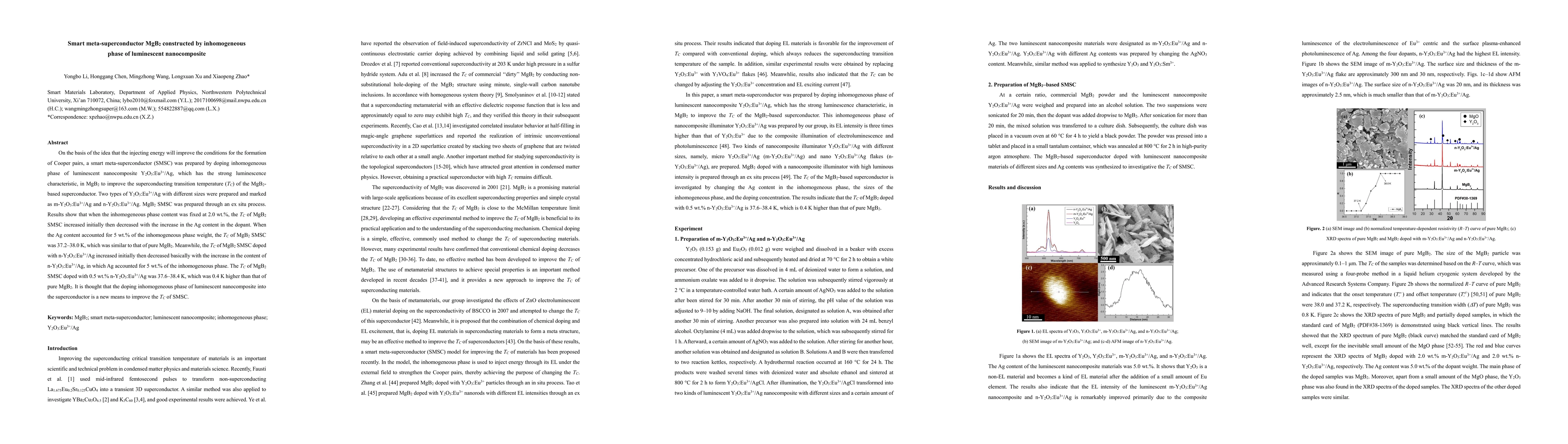 This paper reports the development of a smart meta-superconductor (SMSC) by incorporating luminescent nanocomposite Y2O3:Eu3+/Ag into MgB2 to enhance its superconducting transition temperature (TC). The TC of MgB2 SMSC peaked at 37.2-38.0 K with optimal doping, suggesting a new method for improving superconducting properties.