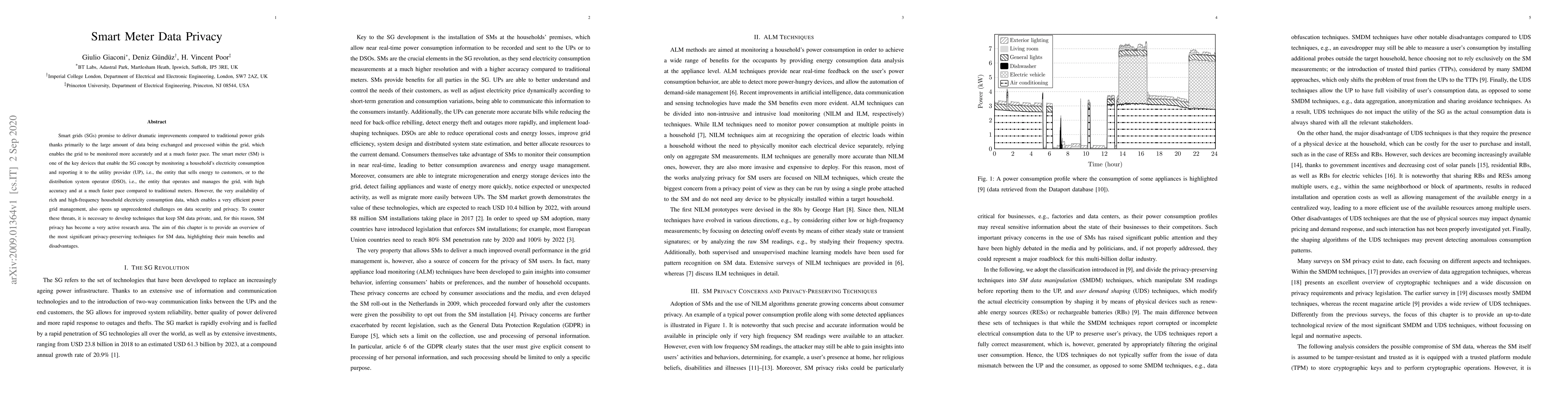 Smart grids (SGs) promise to deliver dramatic improvements compared to traditional power grids thanks primarily to the large amount of data being exchanged and processed within the grid, which enables the grid to be monitored more accurately and at a much faster pace. The smart meter (SM) is one of the key devices that enable the SG concept by monitoring a household's electricity consumption and reporting it to the utility provider (UP), i.e., the entity that sells energy to customers, or to the distribution system operator (DSO), i.e., the entity that operates and manages the grid, with high accuracy and at a much faster pace compared to traditional meters. However, the very availability of rich and high-frequency household electricity consumption data, which enables a very efficient power grid management, also opens up unprecedented challenges on data security and privacy. To counter these threats, it is necessary to develop techniques that keep SM data private, and, for this reason, SM privacy has become a very active research area. The aim of this chapter is to provide an overview of the most significant privacy-preserving techniques for SM data, highlighting their main benefits and disadvantages.