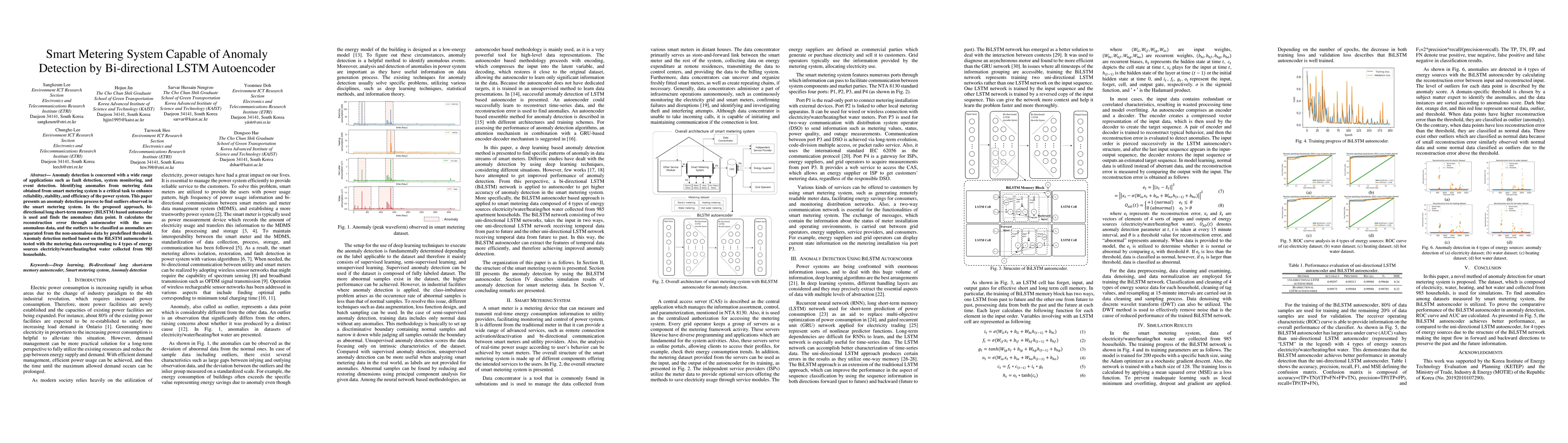 This paper proposes an anomaly detection method using a bi-directional LSTM autoencoder for smart metering systems to identify outliers in data from electricity, water, heating, and hot water sources. The method calculates reconstruction error to classify anomalies based on a predefined threshold.
