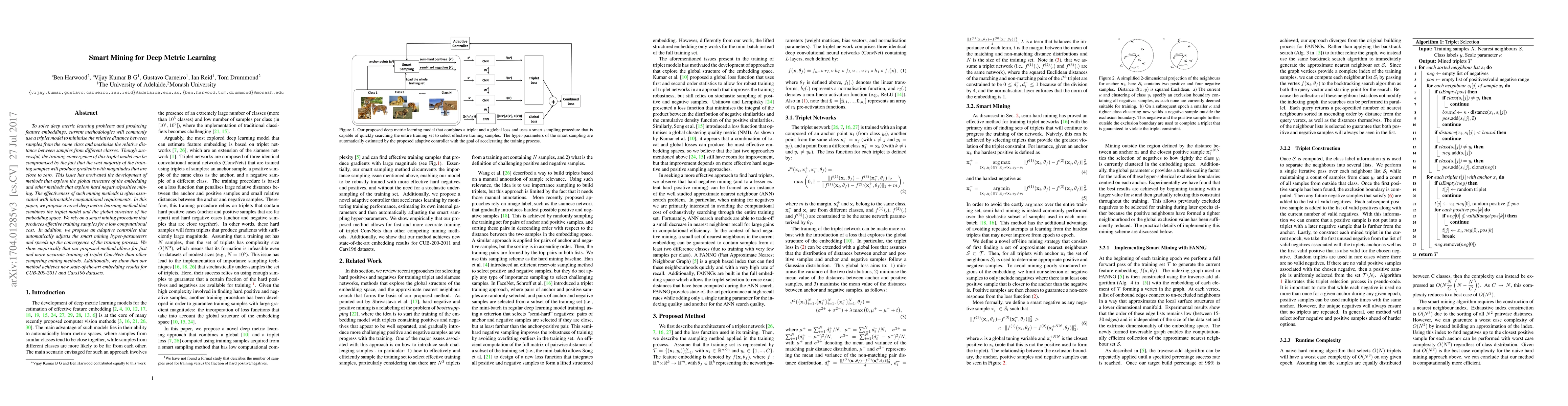 To solve deep metric learning problems and producing feature embeddings, current methodologies will commonly use a triplet model to minimise the relative distance between samples from the same class and maximise the relative distance between samples from different classes. Though successful, the training convergence of this triplet model can be compromised by the fact that the vast majority of the training samples will produce gradients with magnitudes that are close to zero. This issue has motivated the development of methods that explore the global structure of the embedding and other methods that explore hard negative/positive mining. The effectiveness of such mining methods is often associated with intractable computational requirements. In this paper, we propose a novel deep metric learning method that combines the triplet model and the global structure of the embedding space. We rely on a smart mining procedure that produces effective training samples for a low computational cost. In addition, we propose an adaptive controller that automatically adjusts the smart mining hyper-parameters and speeds up the convergence of the training process. We show empirically that our proposed method allows for fast and more accurate training of triplet ConvNets than other competing mining methods. Additionally, we show that our method achieves new state-of-the-art embedding results for CUB-200-2011 and Cars196 datasets.