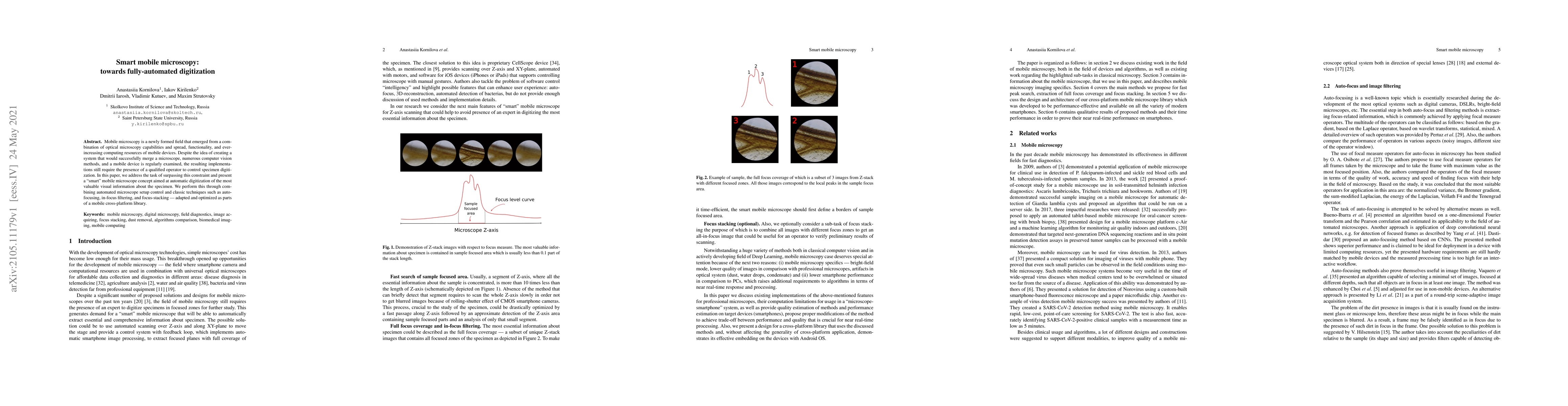 Mobile microscopy is a newly formed field that emerged from a combination of optical microscopy capabilities and spread, functionality, and ever-increasing computing resources of mobile devices. Despite the idea of creating a system that would successfully merge a microscope, numerous computer vision methods, and a mobile device is regularly examined, the resulting implementations still require the presence of a qualified operator to control specimen digitization. In this paper, we address the task of surpassing this constraint and present a ``smart'' mobile microscope concept aimed at automatic digitization of the most valuable visual information about the specimen. We perform this through combining automated microscope setup control and classic techniques such as auto-focusing, in-focus filtering, and focus-stacking -- adapted and optimized as parts of a mobile cross-platform library.
