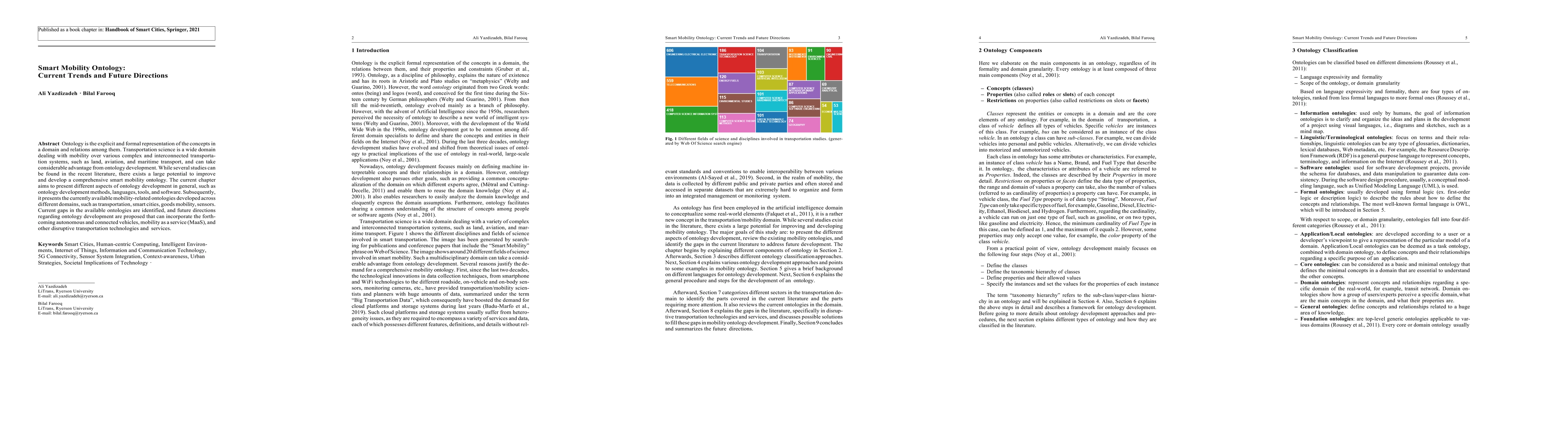 Ontology is the explicit and formal representation of the concepts in a domain and relations among them. Transportation science is a wide domain dealing with mobility over various complex and interconnected transportation systems, such as land, aviation, and maritime transport, and can take considerable advantage from ontology development. While several studies can be found in the recent literature, there exists a large potential to improve and develop a comprehensive smart mobility ontology. The current chapter aims to present different aspects of ontology development in general, such as ontology development methods, languages, tools, and software. Subsequently, it presents the currently available mobility-related ontologies developed across different domains, such as transportation, smart cities, goods mobility, sensors. Current gaps in the available ontologies are identified, and future directions regarding ontology development are proposed that can incorporate the forthcoming autonomous and connected vehicles, mobility as a service (MaaS), and other disruptive transportation technologies and services.