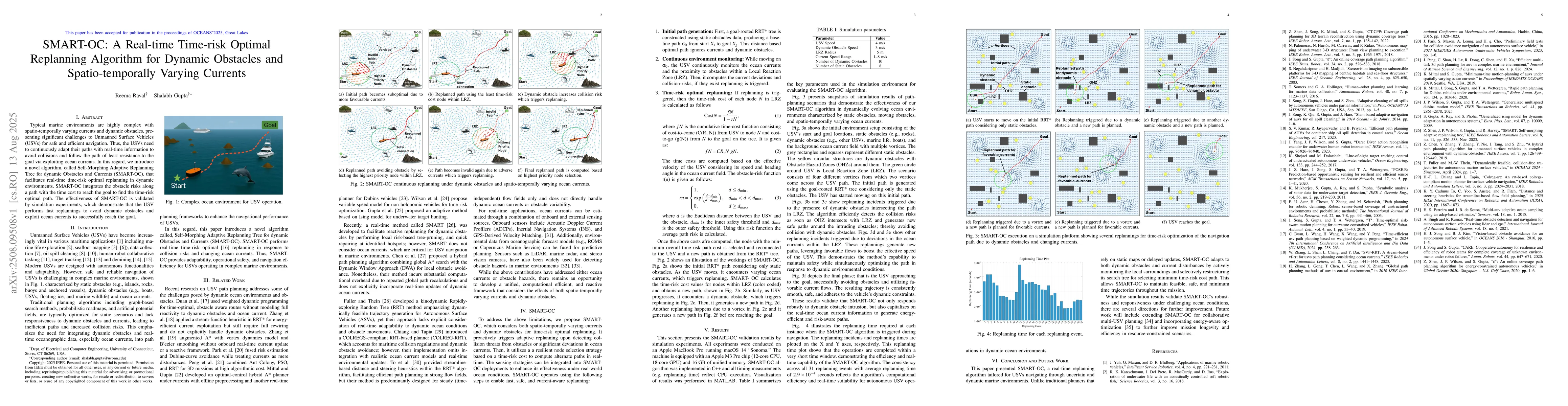 Typical marine environments are highly complex with spatio-temporally varying currents and dynamic obstacles, presenting significant challenges to Unmanned Surface Vehicles (USVs) for safe and efficient navigation. Thus, the USVs need to continuously adapt their paths with real-time information to avoid collisions and follow the path of least resistance to the goal via exploiting ocean currents. In this regard, we introduce a novel algorithm, called Self-Morphing Adaptive Replanning Tree for dynamic Obstacles and Currents (SMART-OC), that facilitates real-time time-risk optimal replanning in dynamic environments. SMART-OC integrates the obstacle risks along a path with the time cost to reach the goal to find the time-risk optimal path. The effectiveness of SMART-OC is validated by simulation experiments, which demonstrate that the USV performs fast replannings to avoid dynamic obstacles and exploit ocean currents to successfully reach the goal.