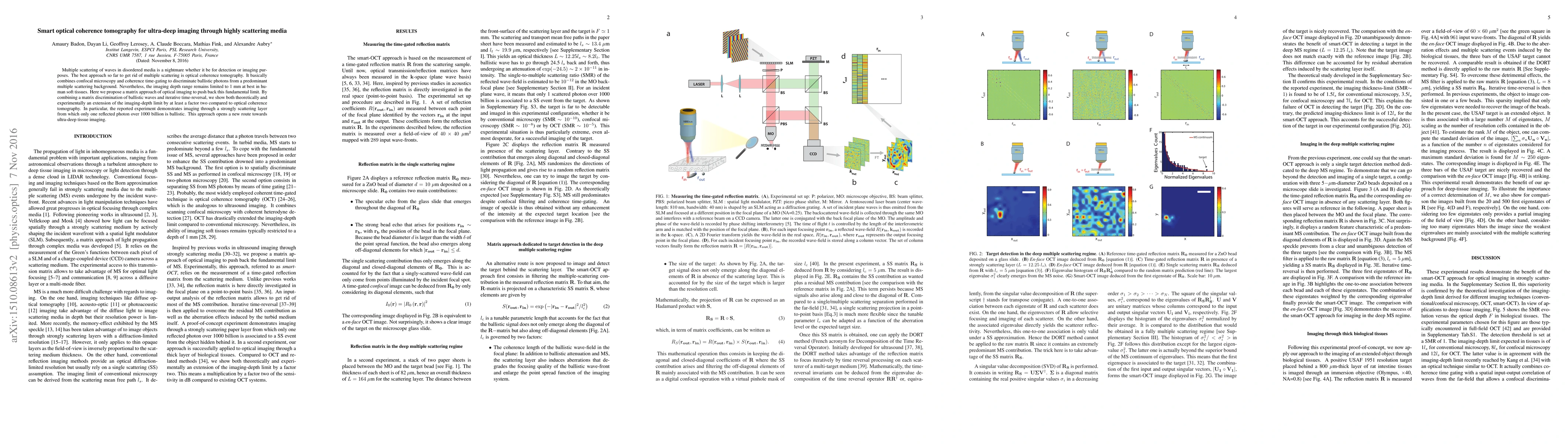This paper proposes a novel matrix approach to optical coherence tomography, combining matrix discrimination and iterative time-reversal to extend imaging depth through highly scattering media. Experimental results show an imaging depth increase by a factor of two, enabling visualization of ballistic photons through a strongly scattering layer.