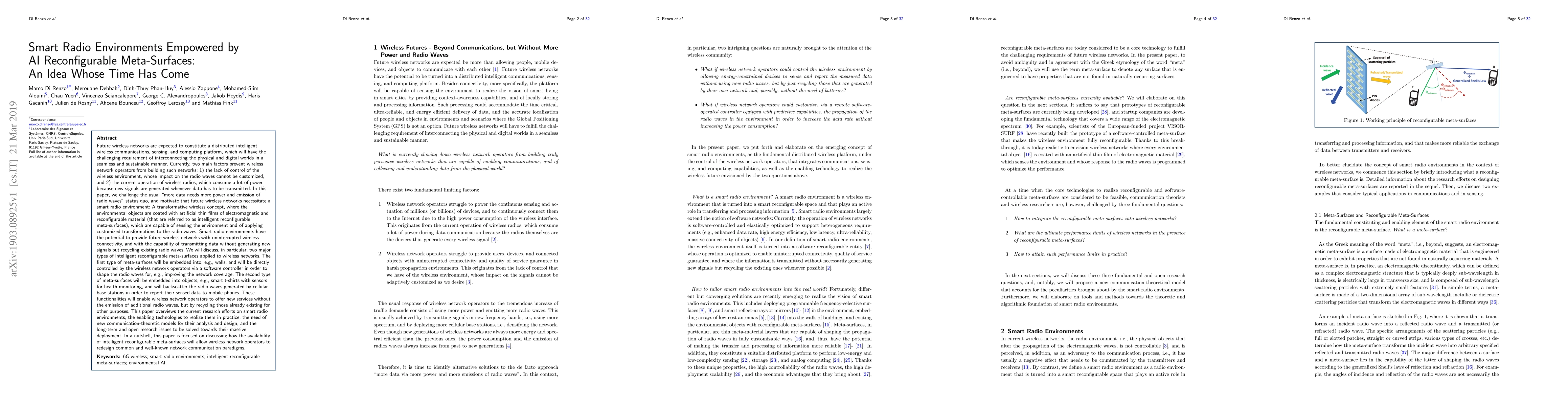This paper explores the transformative potential of smart radio environments enabled by AI-reconfigurable meta-surfaces, which can customize radio wave transformations and recycle existing signals to reduce power consumption and emissions. It discusses current research, enabling technologies, and future challenges for deploying these environments in future wireless networks.