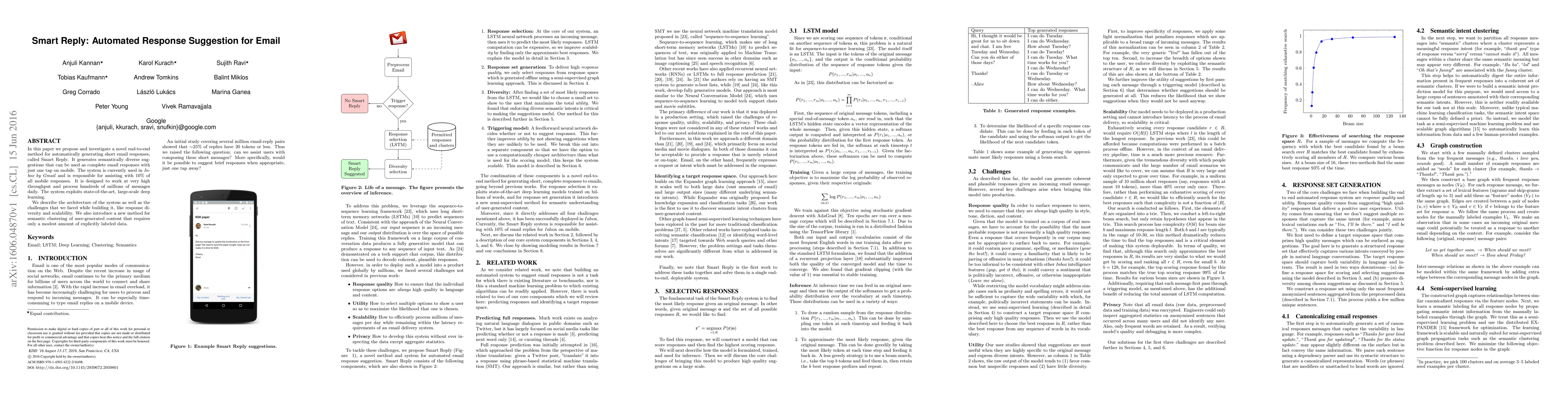 This paper introduces Smart Reply, an automated system for generating email response suggestions, currently used in Inbox by Gmail to assist with 10% of mobile responses. It leverages large-scale deep learning to handle high throughput and scalability, addressing challenges like response diversity and employing a novel semantic clustering method for minimal labeled data.