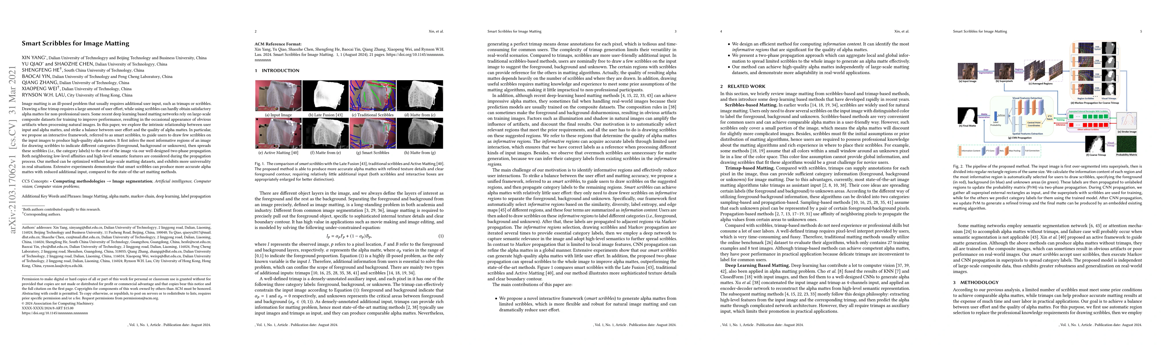 Image matting is an ill-posed problem that usually requires additional user input, such as trimaps or scribbles. Drawing a fne trimap requires a large amount of user effort, while using scribbles can hardly obtain satisfactory alpha mattes for non-professional users. Some recent deep learning-based matting networks rely on large-scale composite datasets for training to improve performance, resulting in the occasional appearance of obvious artifacts when processing natural images. In this article, we explore the intrinsic relationship between user input and alpha mattes and strike a balance between user effort and the quality of alpha mattes. In particular, we propose an interactive framework, referred to as smart scribbles, to guide users to draw few scribbles on the input images to produce high-quality alpha mattes. It frst infers the most informative regions of an image for drawing scribbles to indicate different categories (foreground, background, or unknown) and then spreads these scribbles (i.e., the category labels) to the rest of the image via our well-designed two-phase propagation. Both neighboring low-level afnities and high-level semantic features are considered during the propagation process. Our method can be optimized without large-scale matting datasets and exhibits more universality in real situations. Extensive experiments demonstrate that smart scribbles can produce more accurate alpha mattes with reduced additional input, compared to the state-of-the-art matting methods.