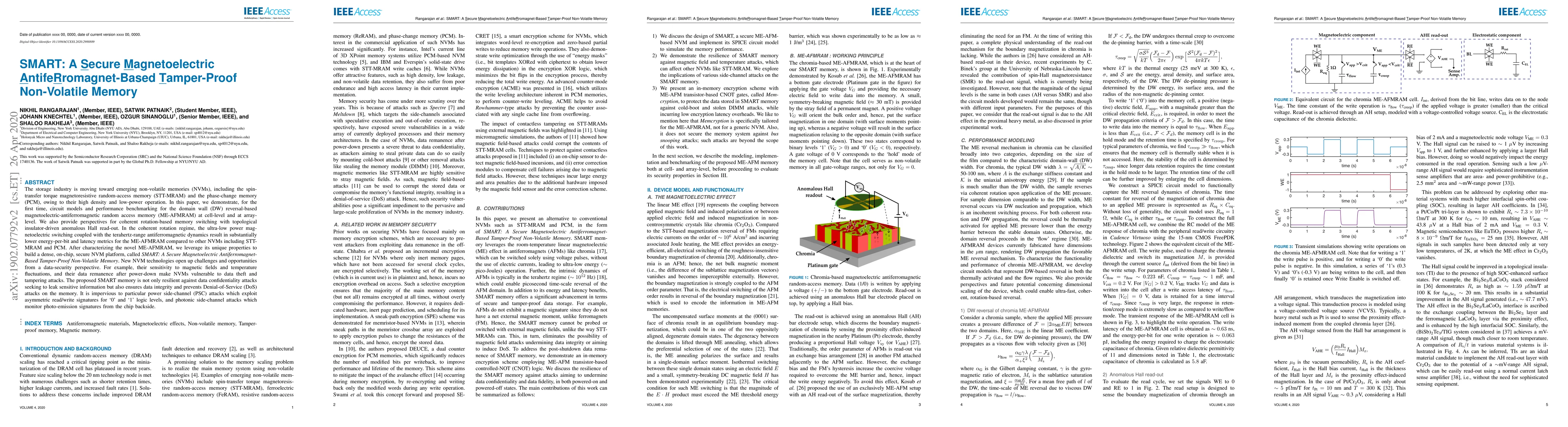 The paper introduces SMART, a secure, tamper-proof non-volatile memory based on magnetoelectric antiferromagnet (ME-AFMRAM), demonstrating superior low-power performance and resilience against data theft and tampering attacks. The novel ME-AFMRAM technology addresses security vulnerabilities of emerging NVMs.