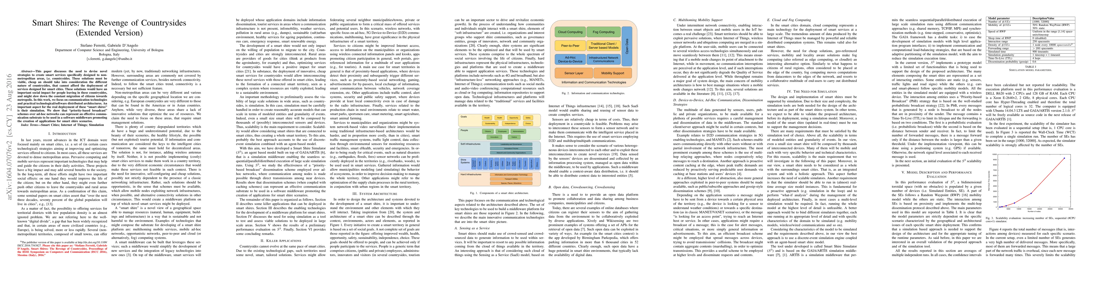 This paper discusses the need to devise novel strategies to create smart services specifically designed to non-metropolitan areas, i.e. countrysides. These solutions must be viable, cheap an should take into consideration the different nature of countrysides, that cannot afford the deployment of services designed for smart cities. These solutions would have an important social impact for people leaving in these countrysides, and might slow down the constant migration of citizens towards metropolis. In this work, we focus on communication technologies and practical technological/software distributed architectures. An important aspect for the real deployment of these smart shires is their simulation. We show that priority-based broadcast schemes over ad-hoc networks can represent an effective communication substrate to be used in a software middleware promoting the creation of applications for smart shire scenarios.