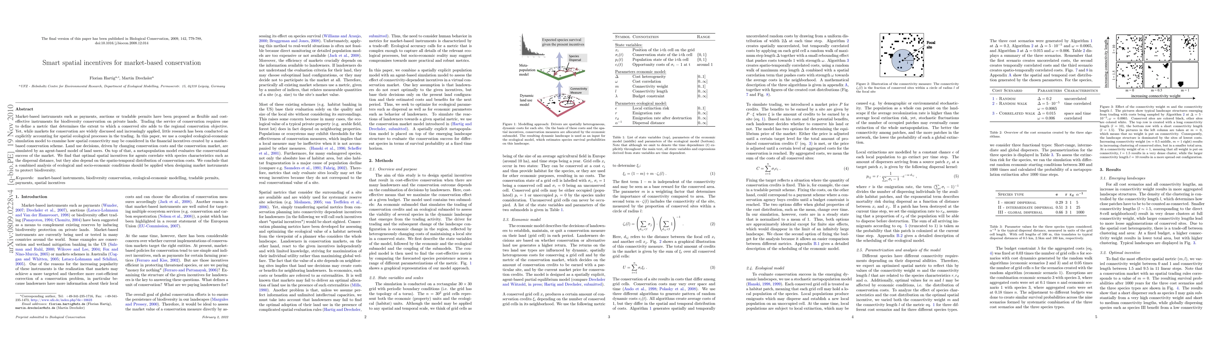 This paper explores how spatial connectivity should influence financial incentives in market-based conservation schemes. Using a coupled ecological-economic simulation model, it finds that optimal spatial incentives depend on species dispersal and the distribution of conservation costs, suggesting that both ecological and socio-economic factors must be integrated into conservation design.