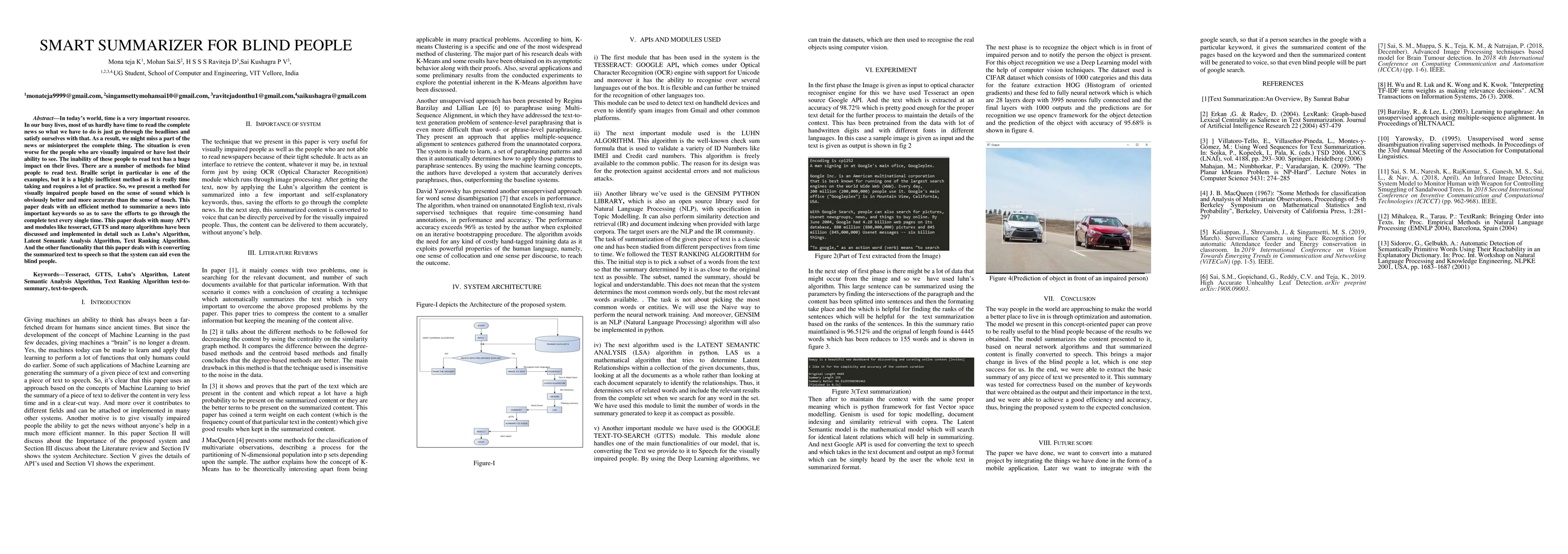 In today's world, time is a very important resource. In our busy lives, most of us hardly have time to read the complete news so what we have to do is just go through the headlines and satisfy ourselves with that. As a result, we might miss a part of the news or misinterpret the complete thing. The situation is even worse for the people who are visually impaired or have lost their ability to see. The inability of these people to read text has a huge impact on their lives. There are a number of methods for blind people to read the text. Braille script, in particular, is one of the examples, but it is a highly inefficient method as it is really time taking and requires a lot of practice. So, we present a method for visually impaired people based on the sense of sound which is obviously better and more accurate than the sense of touch. This paper deals with an efficient method to summarize news into important keywords so as to save the efforts to go through the complete text every single time. This paper deals with many API's and modules like the tesseract, GTTS, and many algorithms that have been discussed and implemented in detail such as Luhn's Algorithm, Latent Semantic Analysis Algorithm, Text Ranking Algorithm. And the other functionality that this paper deals with is converting the summarized text to speech so that the system can aid even the blind people.