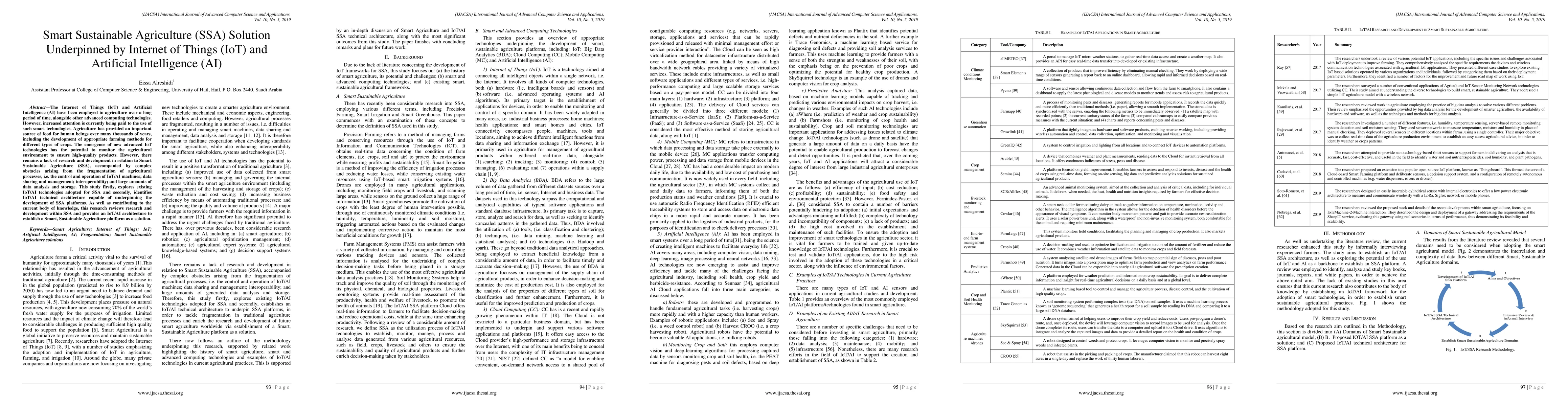 The Internet of Things (IoT) and Artificial Intelligence (AI) have been employed in agriculture over a long period of time, alongside other advanced computing technologies. However, increased attention is currently being paid to the use of such smart technologies. Agriculture has provided an important source of food for human beings over many thousands of years, including the development of appropriate farming methods for different types of crops. The emergence of new advanced IoT technologies has the potential to monitor the agricultural environment to ensure high-quality products. However, there remains a lack of research and development in relation to Smart Sustainable Agriculture (SSA), accompanied by complex obstacles arising from the fragmentation of agricultural processes, i.e. the control and operation of IoT/AI machines; data sharing and management; interoperability; and large amounts of data analysis and storage. This study firstly, explores existing IoT/AI technologies adopted for SSA and secondly, identifies IoT/AI technical architecture capable of underpinning the development of SSA platforms. As well as contributing to the current body of knowledge, this research reviews research and development within SSA and provides an IoT/AI architecture to establish a Smart, Sustainable Agriculture platform as a solution.