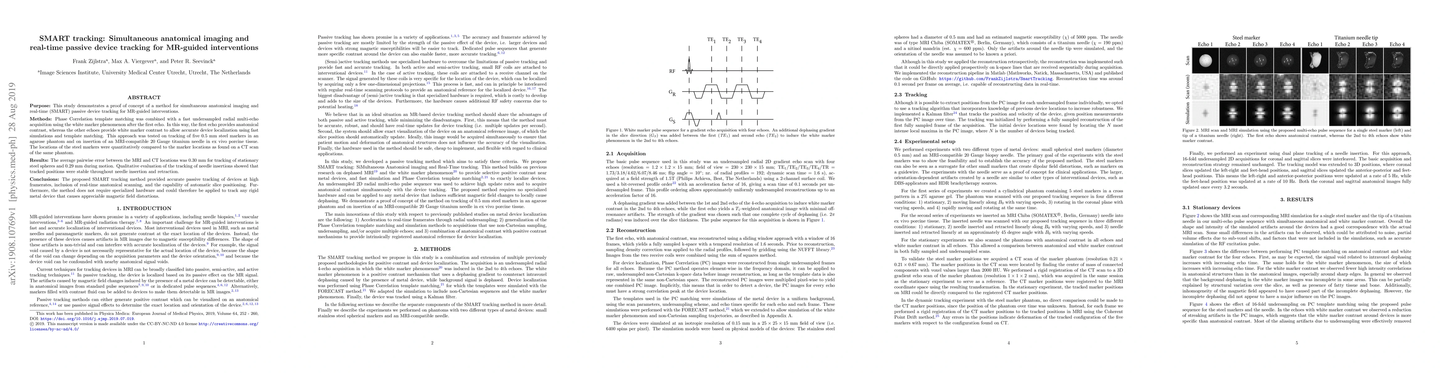 This study introduces SMART tracking for simultaneous anatomical imaging and real-time passive device tracking in MR-guided interventions, achieving an average error of 0.30 mm. The method combines phase correlation and fast undersampled radial multi-echo acquisition, demonstrating accurate tracking of steel markers and MRI-compatible needles.