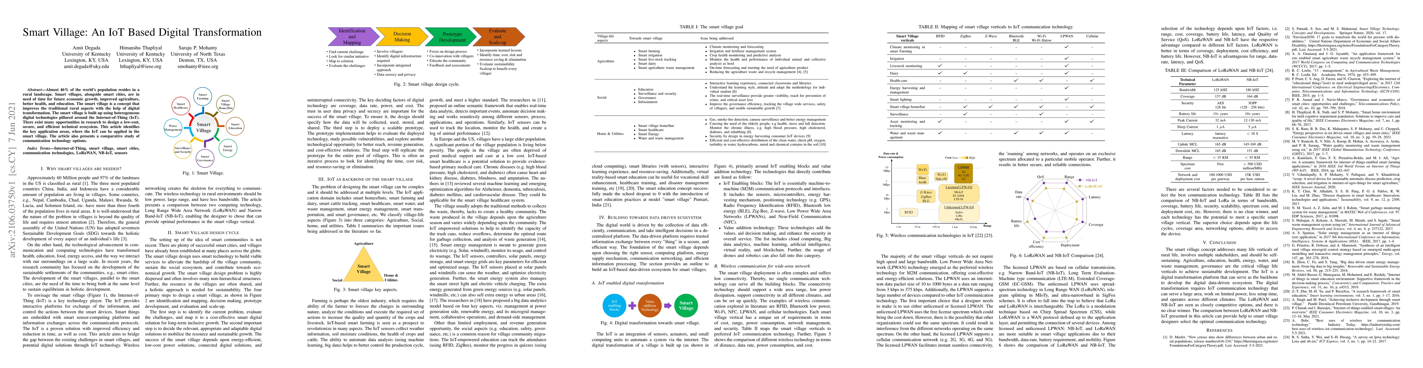 Almost 46% of the world's population resides in a rural landscape. Smart villages, alongside smart cities, are in need of time for future economic growth, improved agriculture, better health, and education. The smart village is a concept that improves the traditional rural aspects with the help of digital transformation. The smart village is built up using heterogeneous digital technologies pillared around the Internet-of-Thing (IoT). There exist many opportunities in research to design a low-cost, secure, and efficient technical ecosystem. This article identifies the key application areas, where the IoT can be applied in the smart village. The article also presents a comparative study of communication technology options.