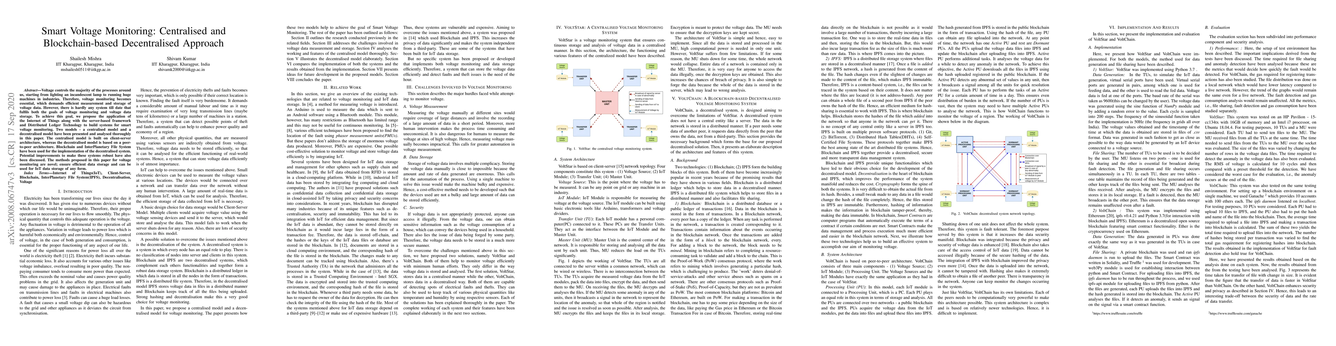This paper proposes a centralized and blockchain-based decentralized approach for smart voltage monitoring, providing efficient data storage and novel methods for IoT applications.
