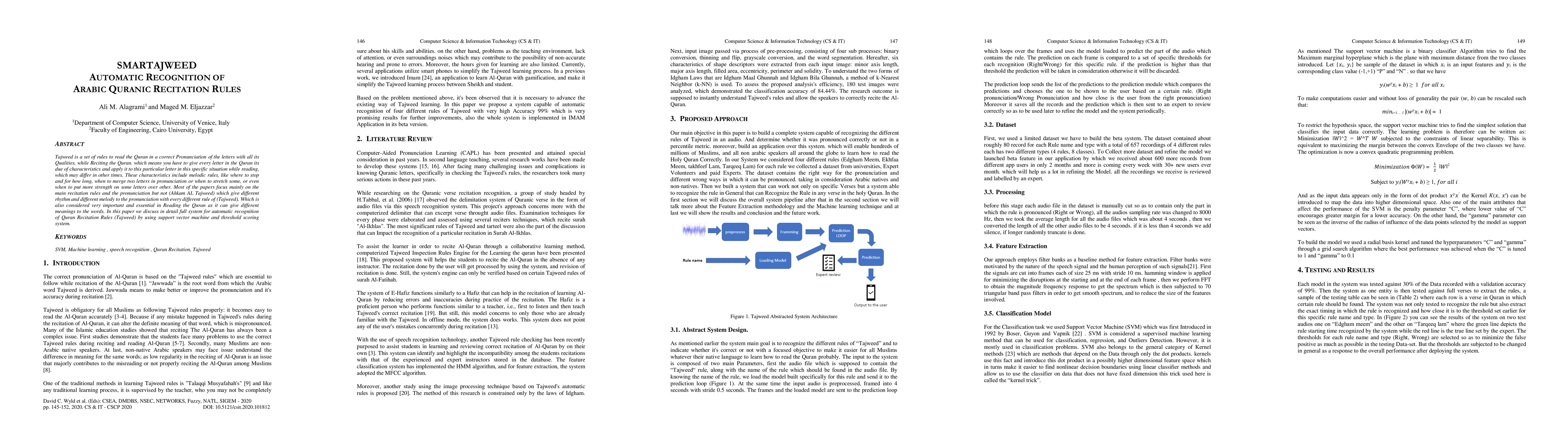 This paper presents a system for automatic recognition of Arabic Quranic recitation rules (Tajweed) using support vector machines and a threshold scoring system. It emphasizes the importance of Ahkam AL Tajweed, which affects the rhythm and melody of pronunciation, and aims to provide a comprehensive solution for identifying these essential recitation rules.